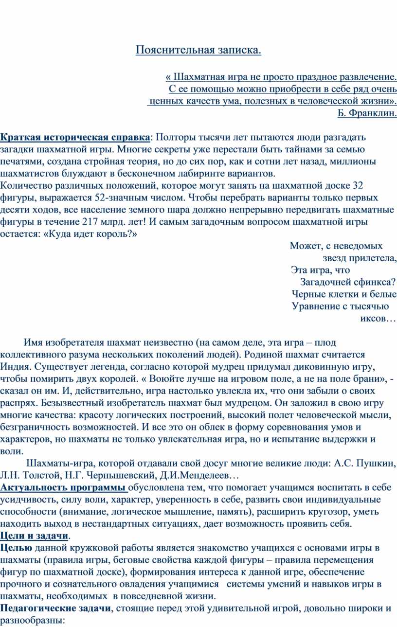 Целью данной кружковой работы является знакомство учащихся с основами игры в шахматы (правила игры, беговые свойства каждой фигуры – правила перемещения фигур по шахматной доске), формирования интереса к данной игре, обеспечение прочного и сознательного овладения учащимися системы умений и навыков игры в шахматы, необходимых в повседневной жизни.