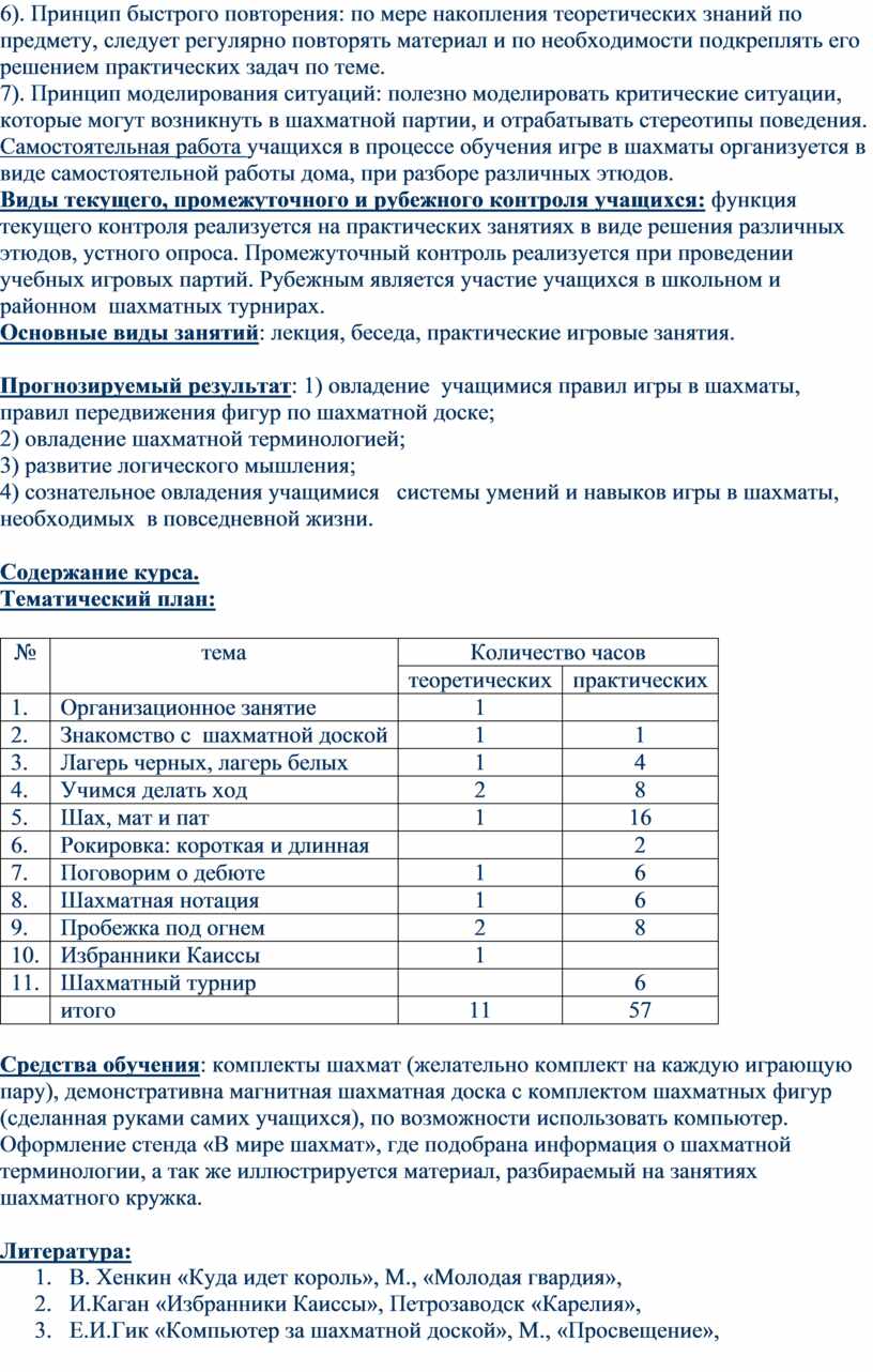 Прогнозируемый результат: 1) овладение учащимися правил игры в шахматы, правил передвижения фигур по шахматной доске;