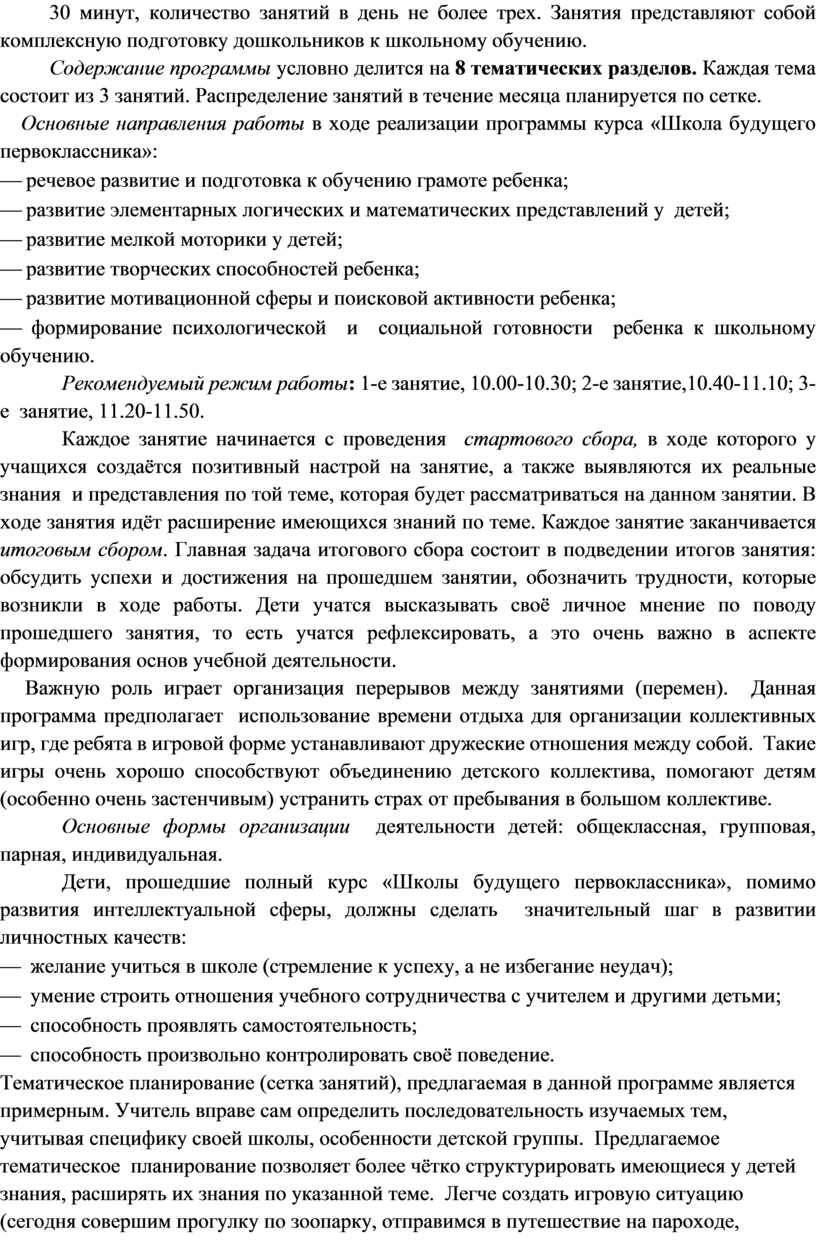 Программа курса «Школа будущего первоклассника» рассчитана на 2 календарных месяца, 24 академических часа. Оптимальным днем для проведения занятий является суббота, когда дети свободны от посещения дошкольного учреждения. В «Школу будущего первоклассника» принимаются дети дошкольного возраста (6-6,5 лет) на основании заявлений родителей (законных представителей). Продолжительность занятий 30 минут, количество занятий в день не более трех. Занятия представляют собой комплексную подготовку дошкольников к школьному обучению.