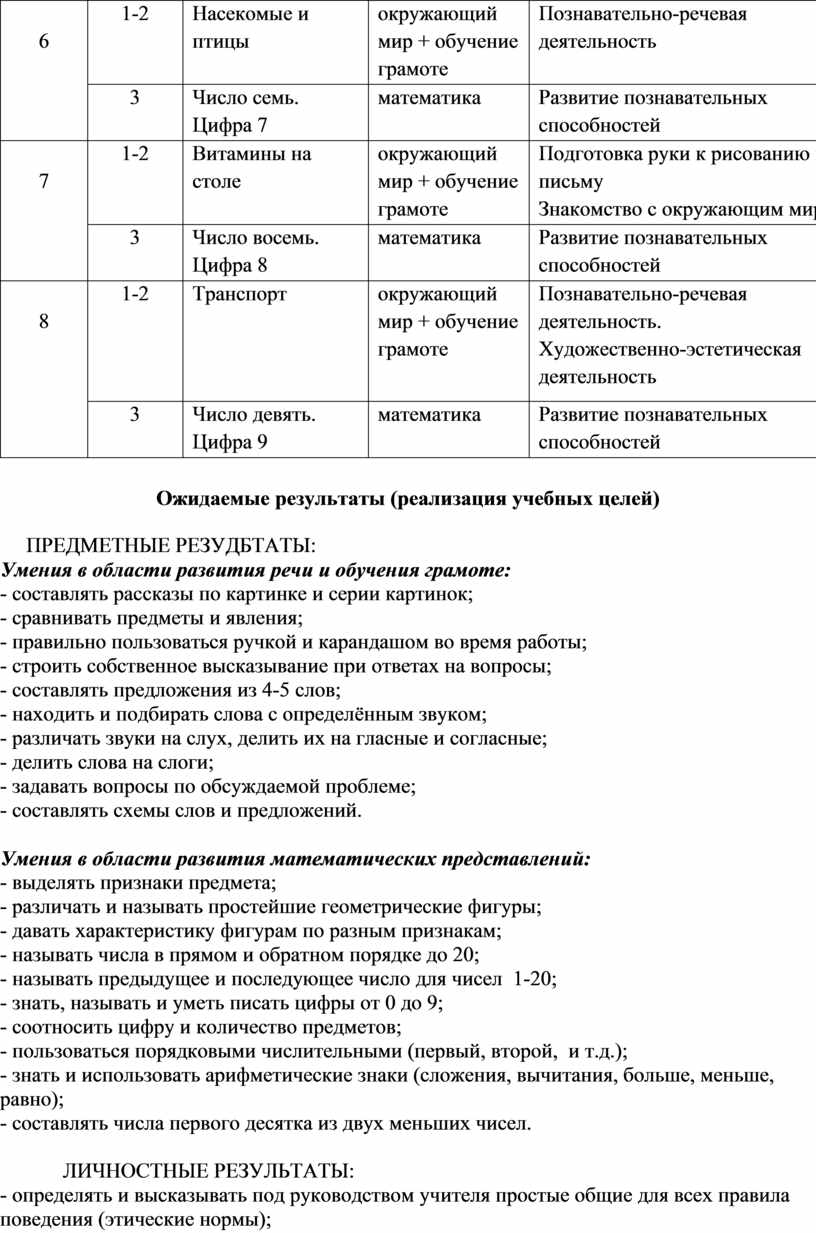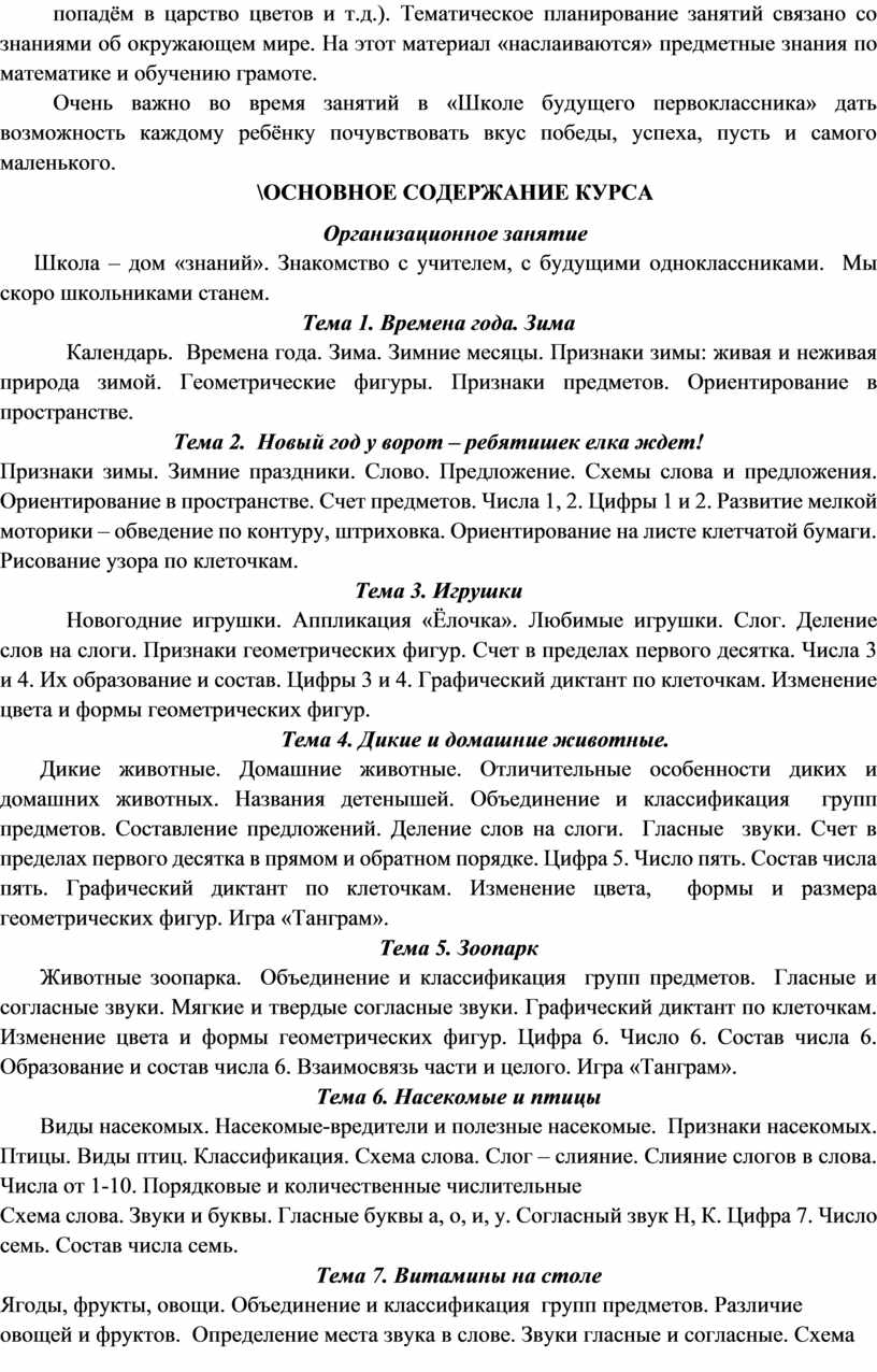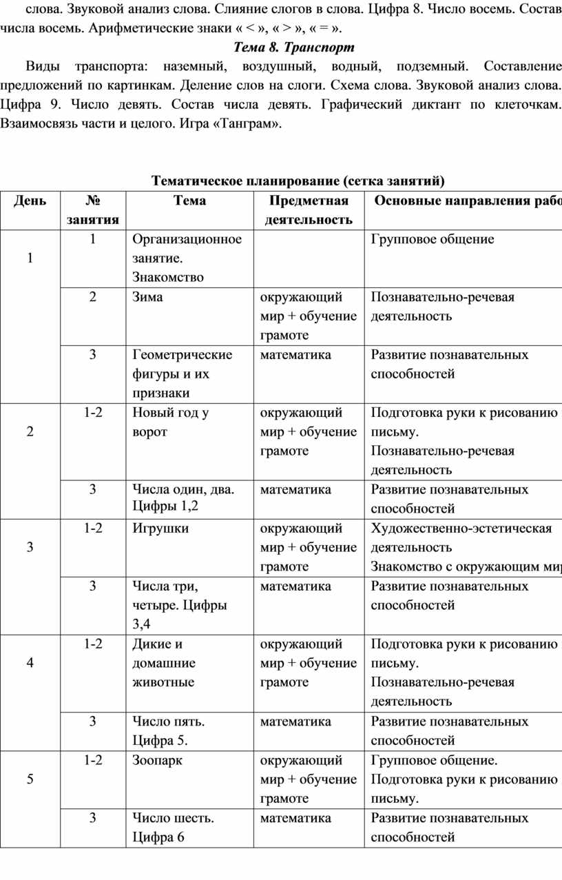 Тематическое планирование (сетка занятий), предлагаемая в данной программе является примерным. Учитель вправе сам определить последовательность изучаемых тем, учитывая специфику своей школы, особенности детской группы. Предлагаемое тематическое планирование позволяет более чётко структурировать имеющиеся у детей знания, расширять их знания по указанной теме. Легче создать игровую ситуацию (сегодня совершим прогулку по зоопарку, отправимся в путешествие на пароходе, попадём в царство цветов и т.д.). Тематическое планирование занятий связано со знаниями об окружающем мире. На этот материал «наслаиваются» предметные знания по математике и обучению грамоте.