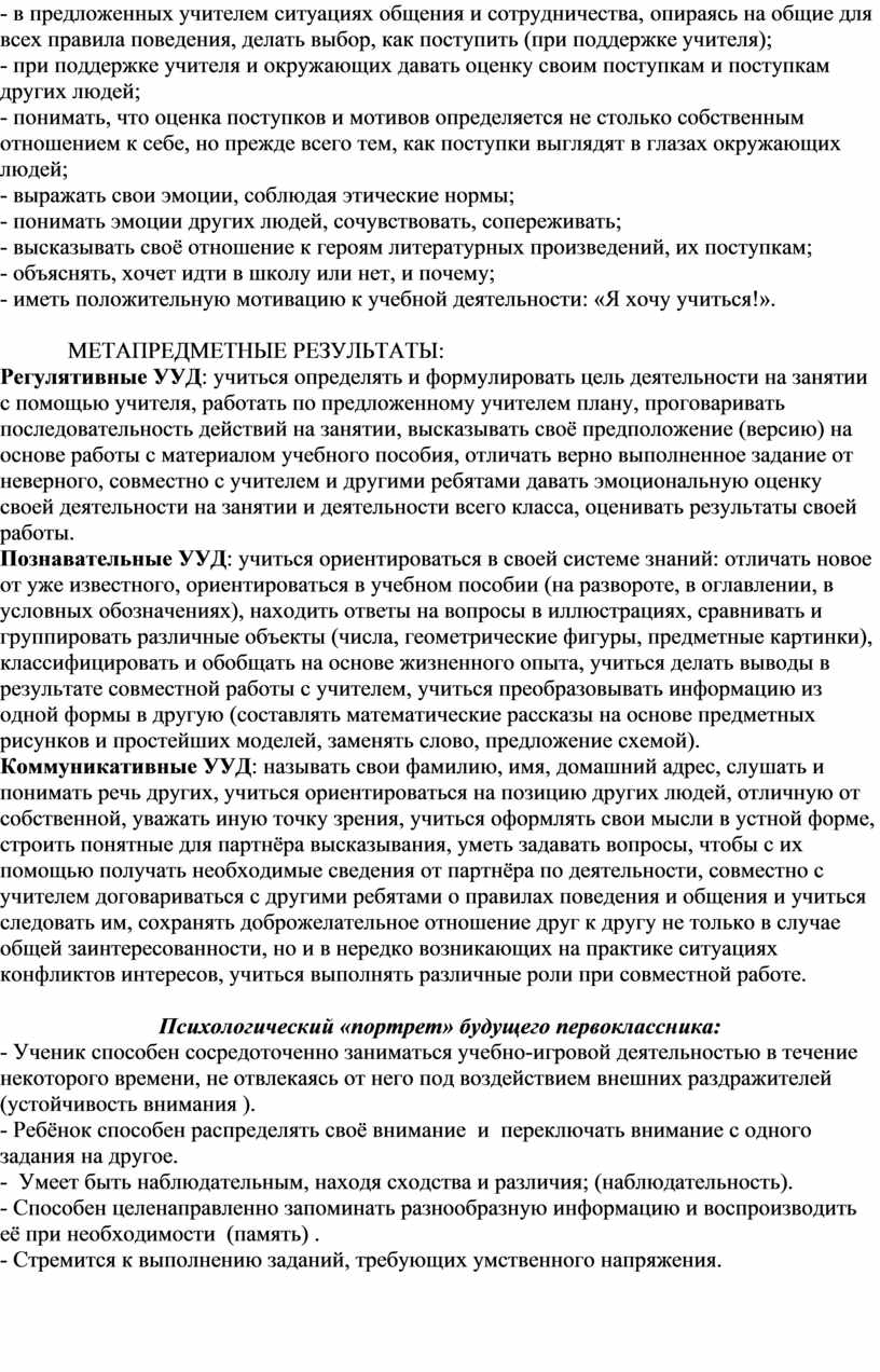 Познавательные УУД: учиться ориентироваться в своей системе знаний: отличать новое от уже известного, ориентироваться в учебном пособии (на развороте, в оглавлении, в условных обозначениях), находить ответы на вопросы в иллюстрациях, сравнивать и группировать различные объекты (числа, геометрические фигуры, предметные картинки), классифицировать и обобщать на основе жизненного опыта, учиться делать выводы в результате совместной работы с учителем, учиться преобразовывать информацию из одной формы в другую (составлять математические рассказы на основе предметных рисунков и простейших моделей, заменять слово, предложение схемой).