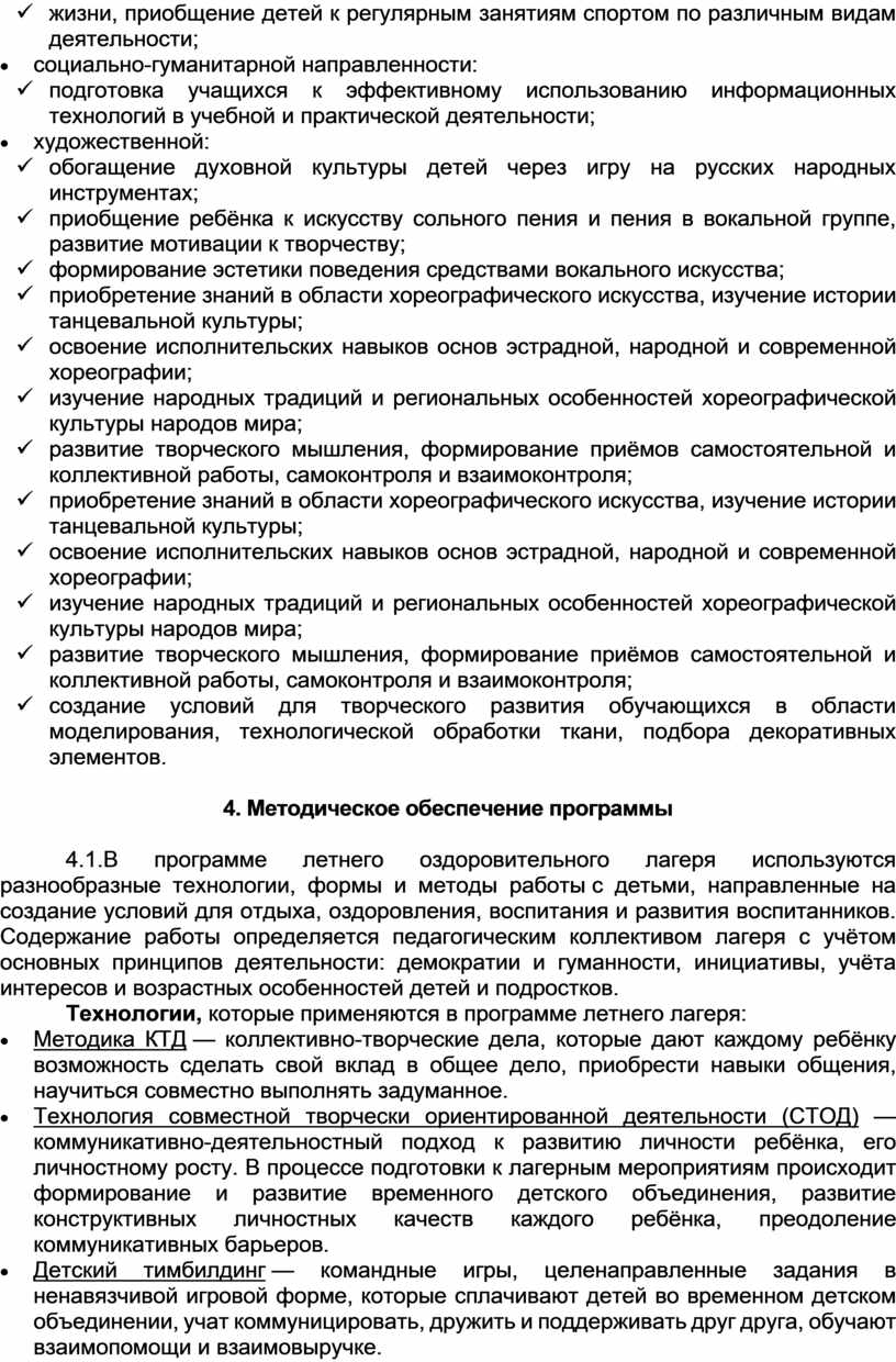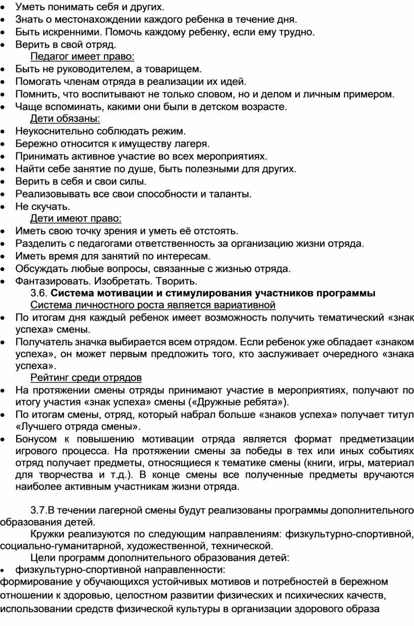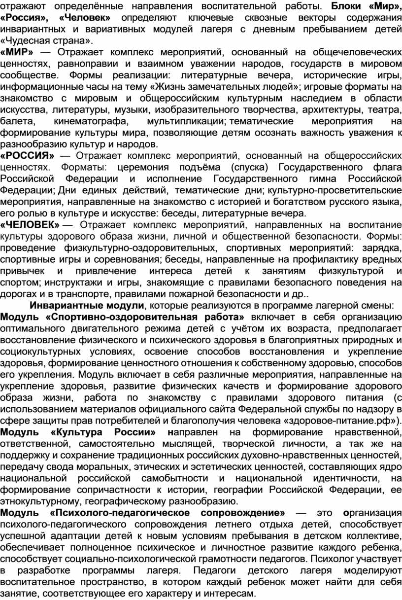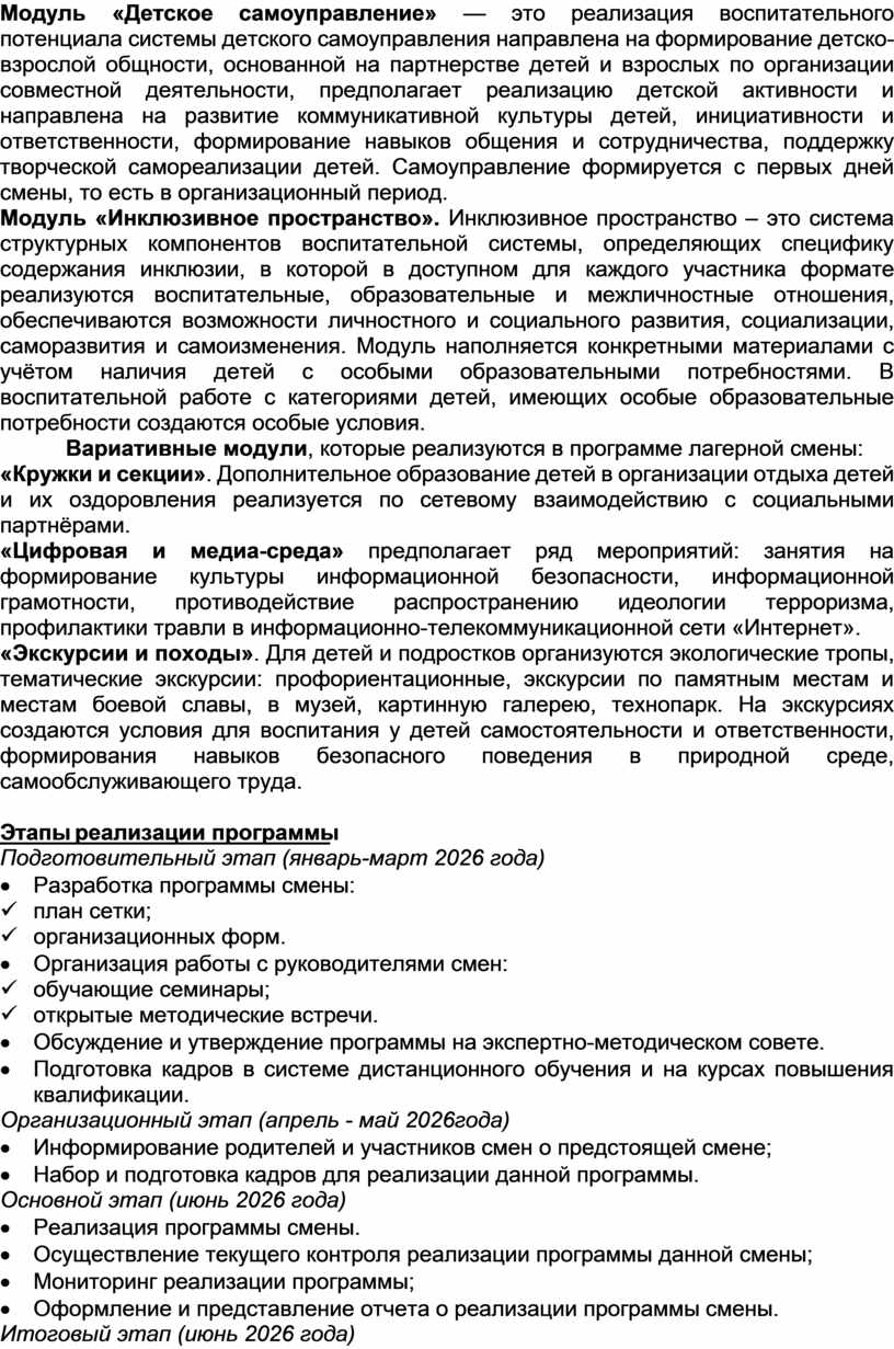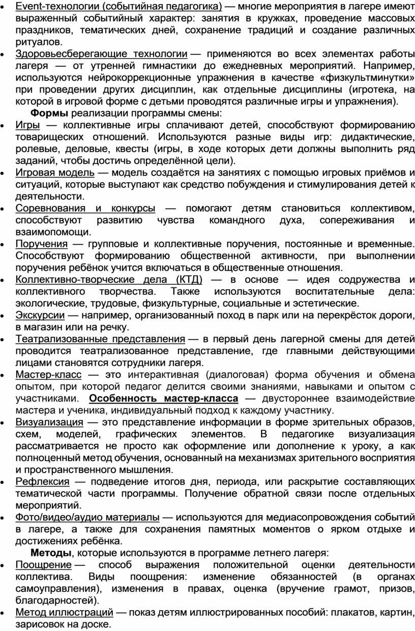 В программе учитываются традиции лагеря, уровень подготовки педагогического коллектива, опыт прошлых лет по организации летнего отдыха. Она направлена на актуализацию единых подходов к воспитанию и развитию детей в преемственности с единой системой воспитания и государственной политики в области образования подрастающего поколения в Российской Федерации. Предусмотрено привлечение ребёнка к участию в делах отряда и всей организации отдыха, включение в органы самоуправления. В программе на протяжении нескольких лет проводятся мероприятия, направленные на формирование у детей патриотического духа, любви и уважения к своей Родине, старшему поколению, народу в целом.