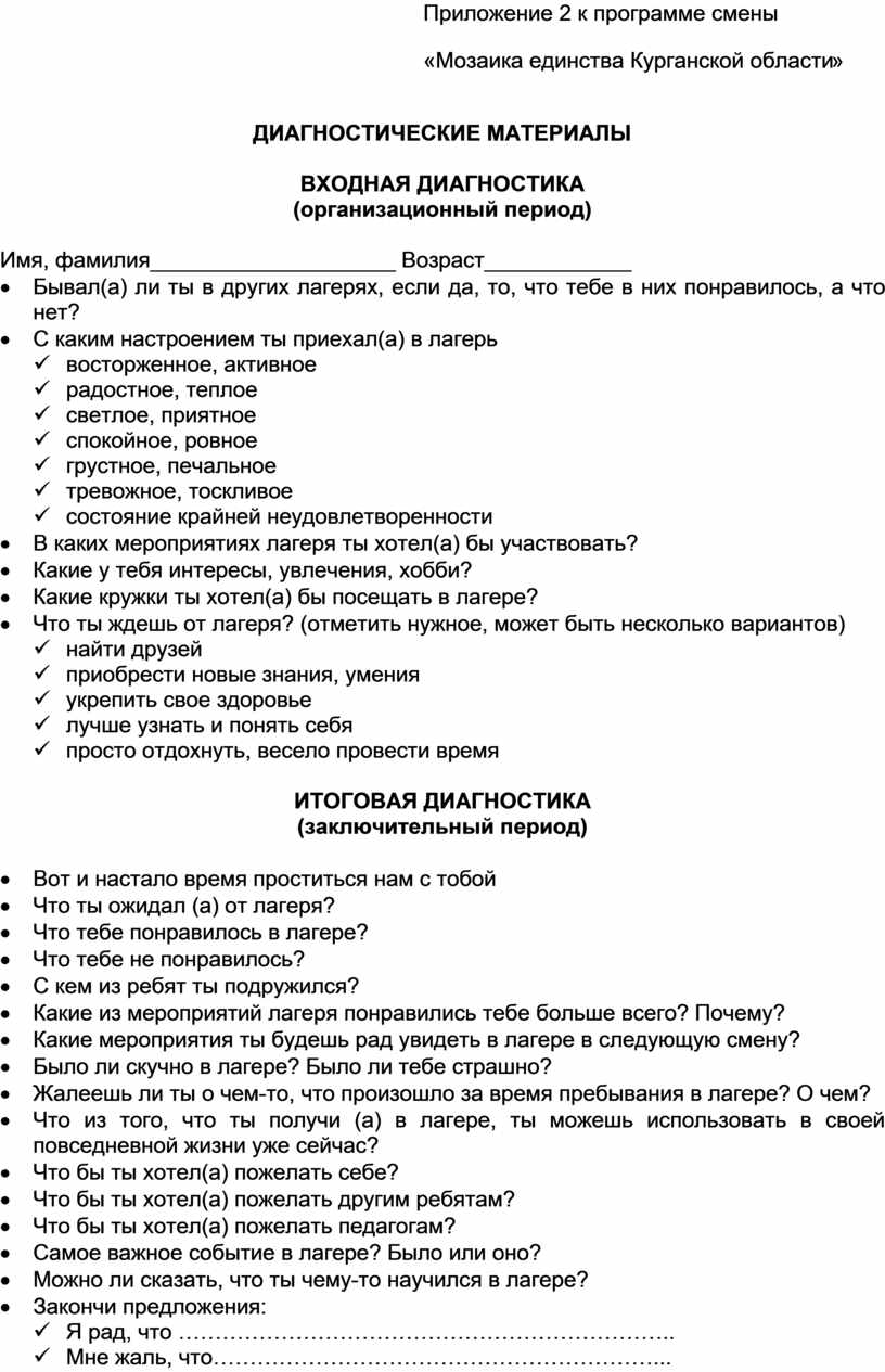 · Разработать программу смены «Мозаика единства Курганской области» и скорректировать ее в соответствии с условиями лагеря.
