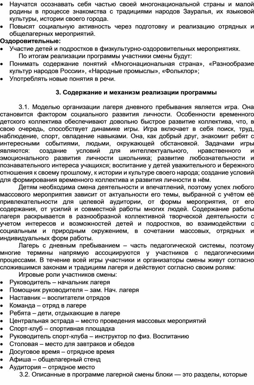 3.1. Моделью организации лагеря дневного пребывания является игра. Она становится фактором социального развития личности. Особенности временного детского коллектива обеспечивают довольно быстрое развитие коллектива, что, в свою очередь, способствует динамике игры. Игра включает в себя поиск, труд, наблюдение, спорт, овладение навыками. Она, как добрый друг, знакомит ребят с интересными событиями, людьми, окружающей обстановкой. Задачами игры являются: создание условий для интеллектуального, нравственного и эмоционального развития личности школьника; развитие любознательности и познавательного интереса учащихся; воспитание у детей уважительного и бережного отношения к своему прошлому, к истории и культуре своего народа; создание условий для формирования временного коллектива и развития личности в нём.