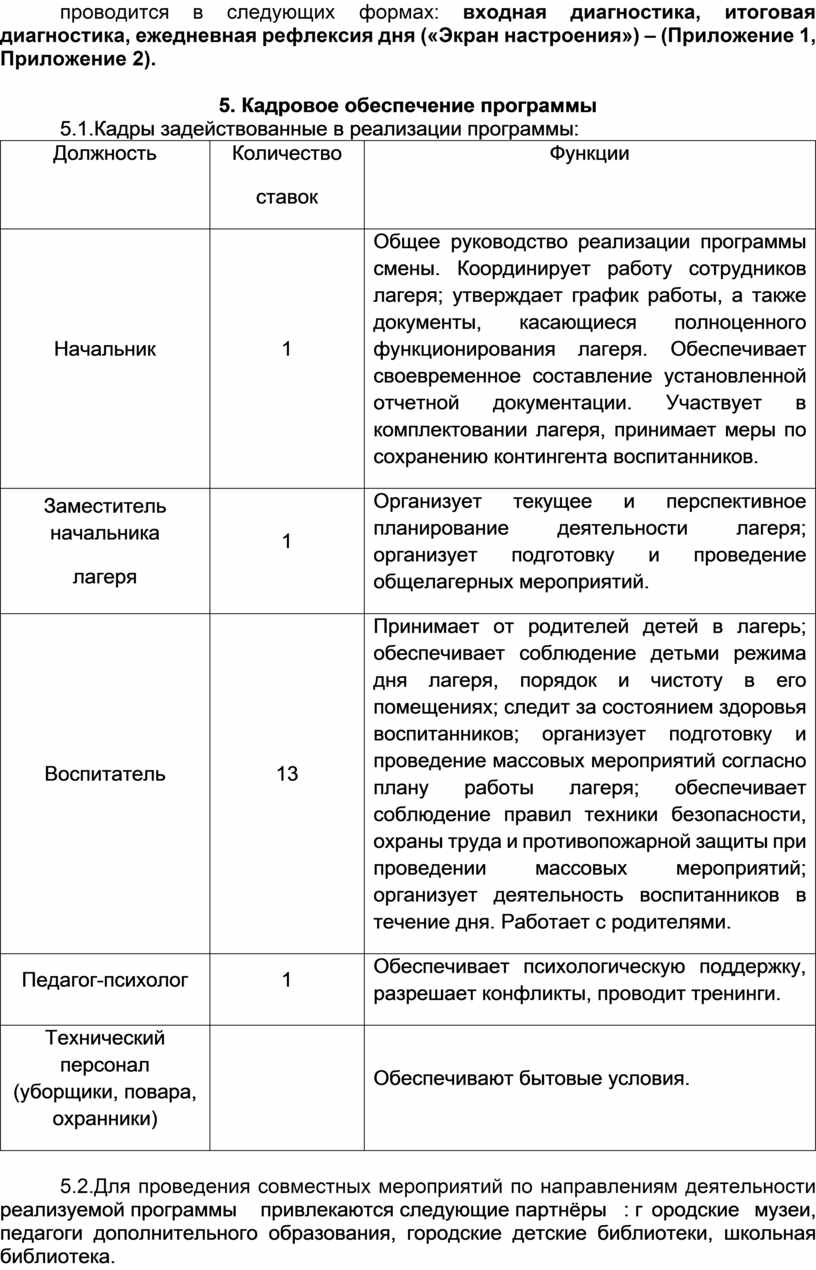 · Подобрать кадры для реализации программы смены и согласовать участие в реализации программы партнеров.