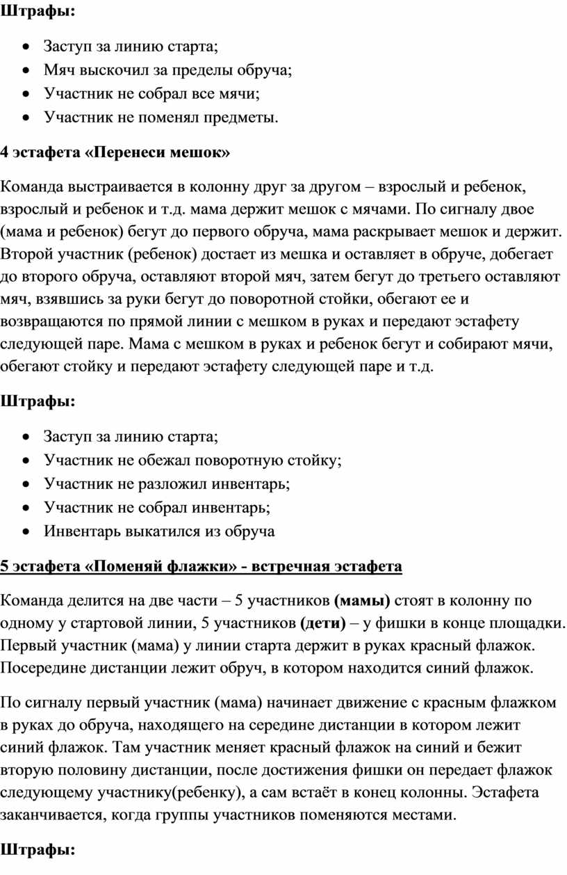 Команда выстраивается в колонну друг за другом – взрослый и ребенок, взрослый и ребенок и т.д. мама держит мешок с мячами. По сигналу двое (мама и ребенок) бегут до первого обруча, мама раскрывает мешок и держит. Второй участник (ребенок) достает из мешка и оставляет в обруче, добегает до второго обруча, оставляют второй мяч, затем бегут до третьего оставляют мяч, взявшись за руки бегут до поворотной стойки, обегают ее и возвращаются по прямой линии с мешком в руках и передают эстафету следующей паре. Мама с мешком в руках и ребенок бегут и собирают мячи, обегают стойку и передают эстафету следующей паре и т.д.