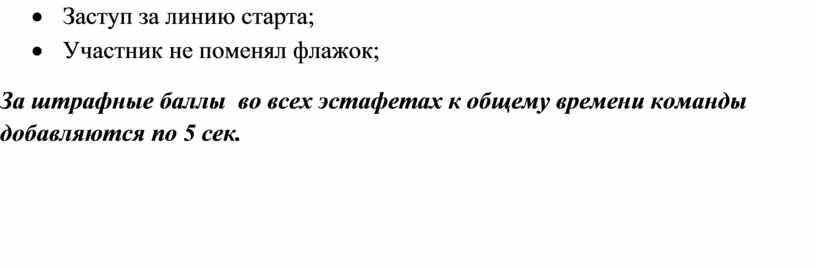 За штрафные баллы во всех эстафетах к общему времени команды добавляются по 5 сек.