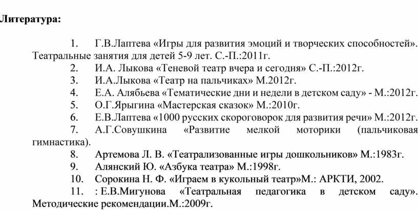 1. Г.В.Лаптева «Игры для развития эмоций и творческих способностей». Театральные занятия для детей 5-9 лет. С.-П.:2011г.