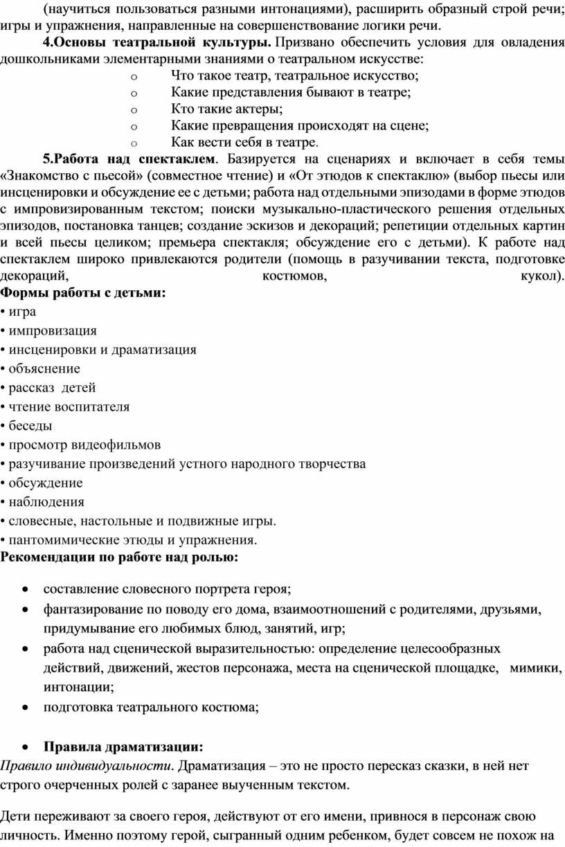 4.Основы театральной культуры. Призвано обеспечить условия для овладения дошкольниками элементарными знаниями о театральном искусстве: