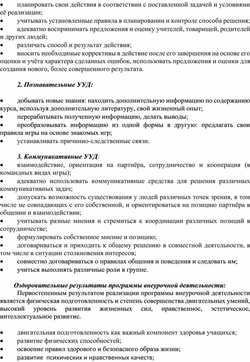 Первостепенным результатом реализации программы внеурочной деятельности является физическая подготовленность и степень совершенства двигательных умений, высокий уровень развития жизненных сил, нравственное, эстетическое, интеллектуальное развитие.