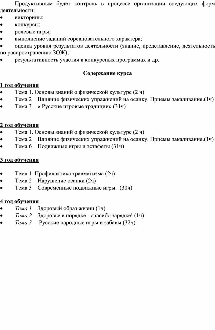 Формы занятий. Содержание занятий должно быть взаимосвязано с учебной программой по физической культуре. Основу составляют общеразвивающие упражнения с предметами и без предметов. Основная форма занятий - урочная, с активным участием обучающихся в ее организации и проведении. Во время занятий в игровой и соревновательной форме выполняются игры и упражнения, изученные на уроках физической культуры.