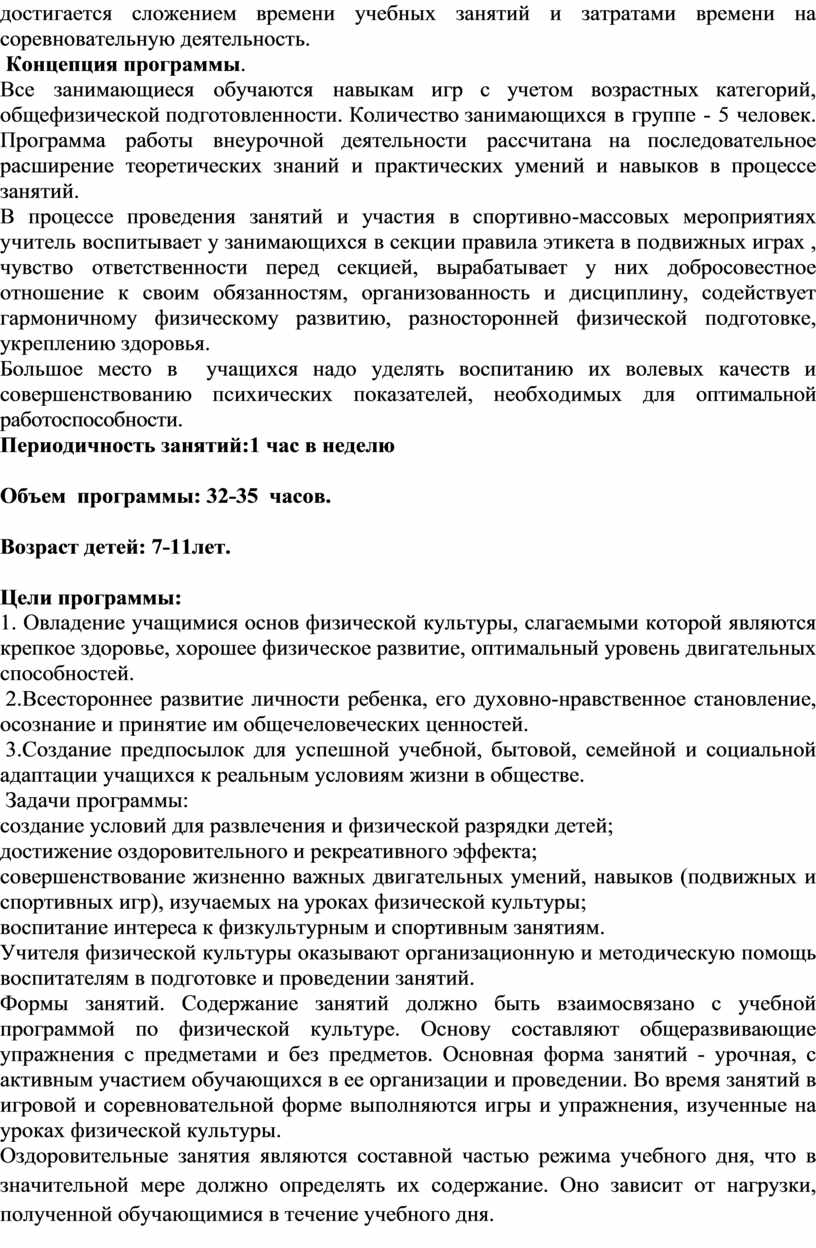 Все занимающиеся обучаются навыкам игр с учетом возрастных категорий, общефизической подготовленности. Количество занимающихся в группе - 5 человек. Программа работы внеурочной деятельности рассчитана на последовательное расширение теоретических знаний и практических умений и навыков в процессе занятий.