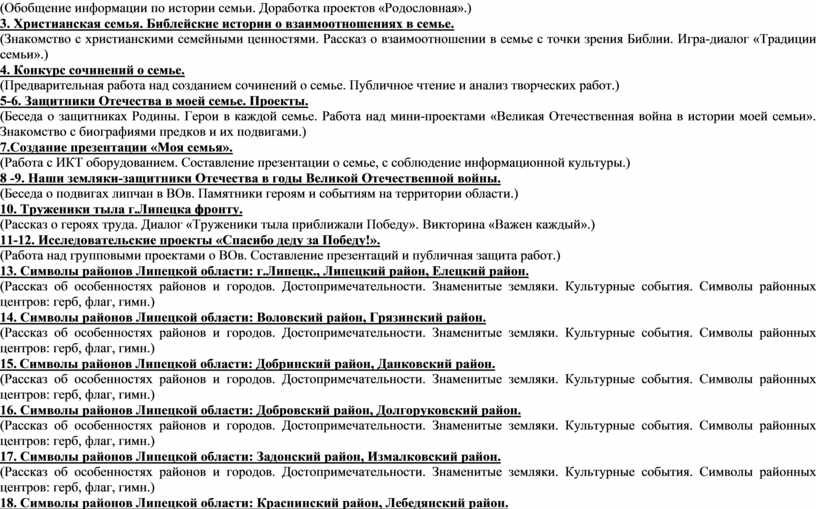 (Состав семьи. Знакомство с терминами родства. «Вся семья вместе, так и душа на месте». Семейные вечера и праздники. «На что и клад, коли в семье лад».)