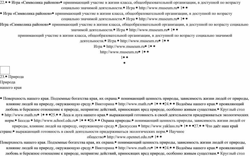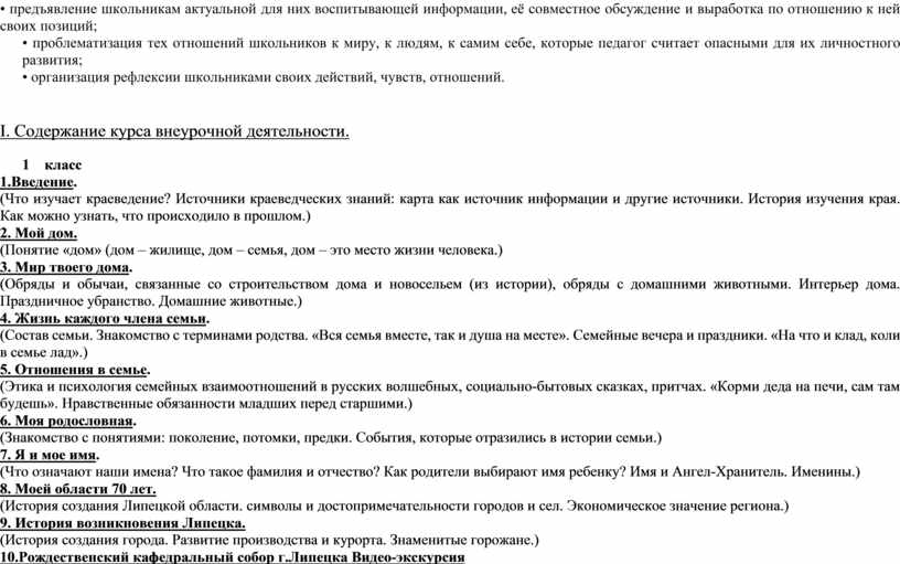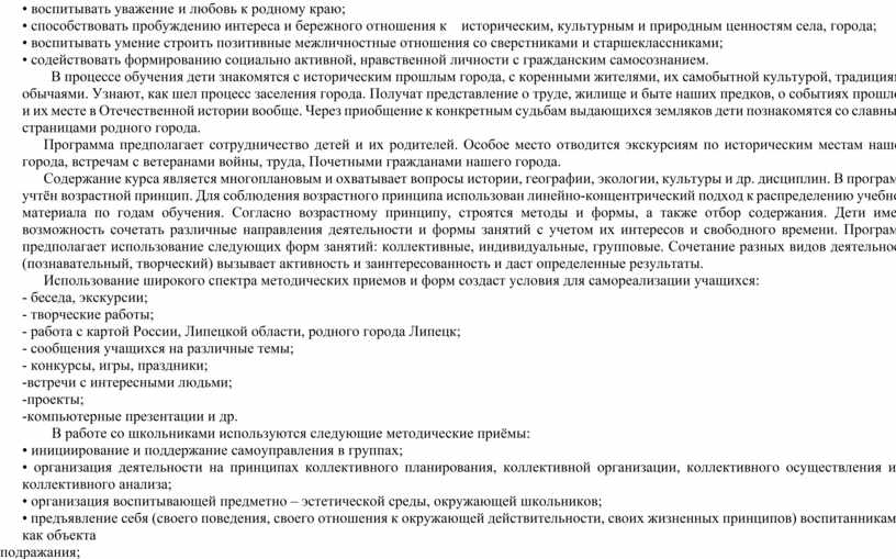 Содержание курса является многоплановым и охватывает вопросы истории, географии, экологии, культуры и др. дисциплин. В программе учтён возрастной принцип. Для соблюдения возрастного принципа использован линейно-концентрический подход к распределению учебного материала по годам обучения. Согласно возрастному принципу, строятся методы и формы, а также отбор содержания. Дети имеют возможность сочетать различные направления деятельности и формы занятий с учетом их интересов и свободного времени. Программа предполагает использование следующих форм занятий: коллективные, индивидуальные, групповые. Сочетание разных видов деятельности (познавательный, творческий) вызывает активность и заинтересованность и даст определенные результаты.