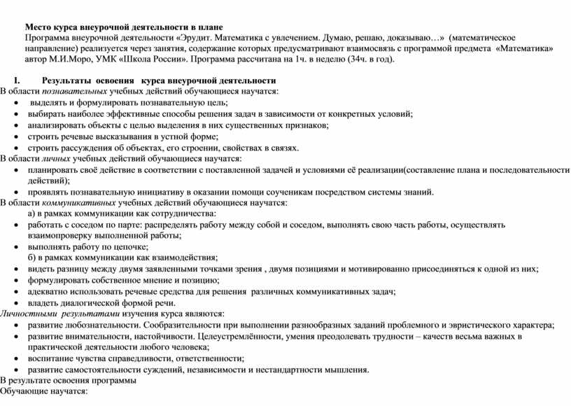 Программа внеурочной деятельности «Эрудит. Математика с увлечением. Думаю, решаю, доказываю…» (математическое направление) реализуется через занятия, содержание которых предусматривают взаимосвязь с программой предмета «Математика» автор М.И.Моро, УМК «Школа России». Программа рассчитана на 1ч. в неделю (34ч. в год).