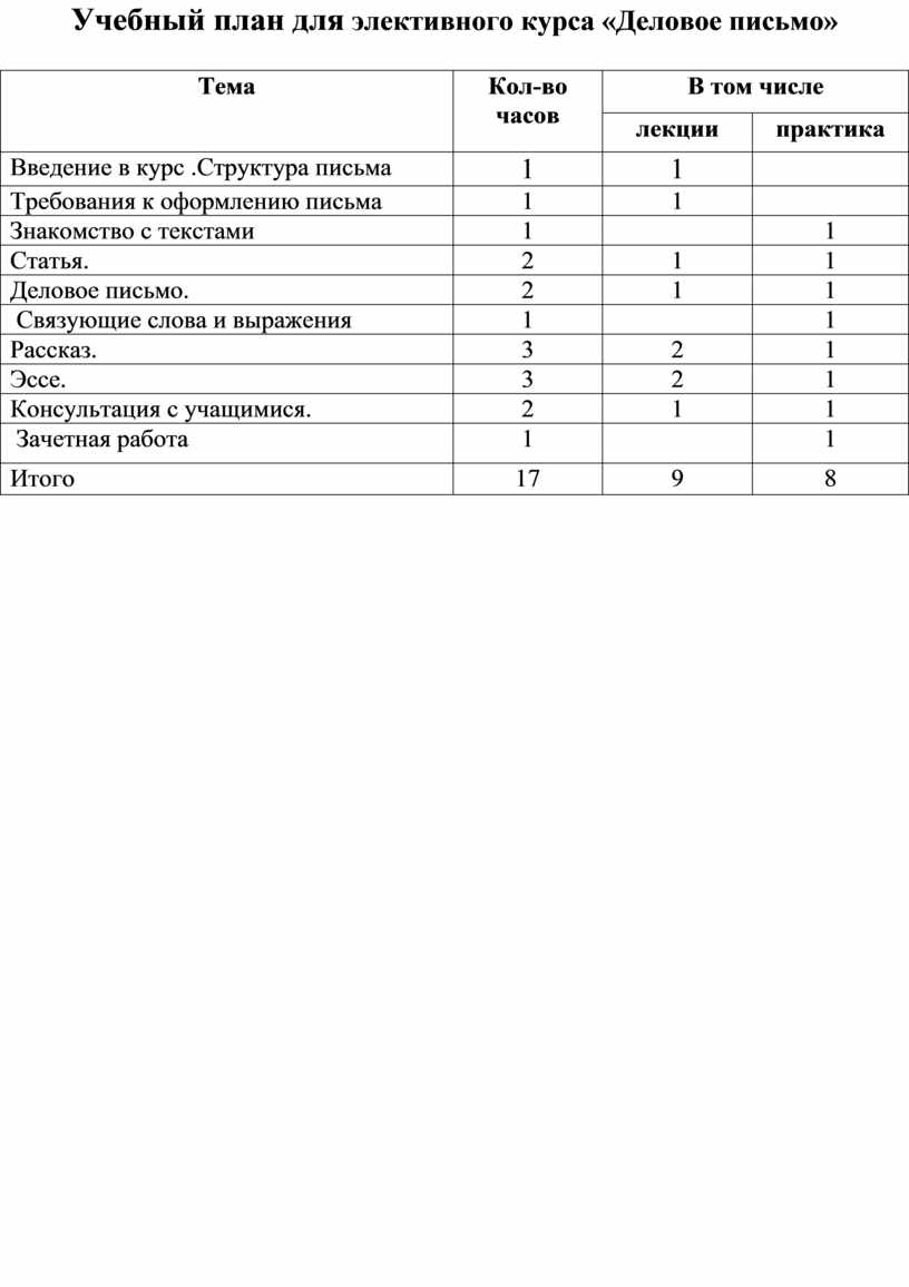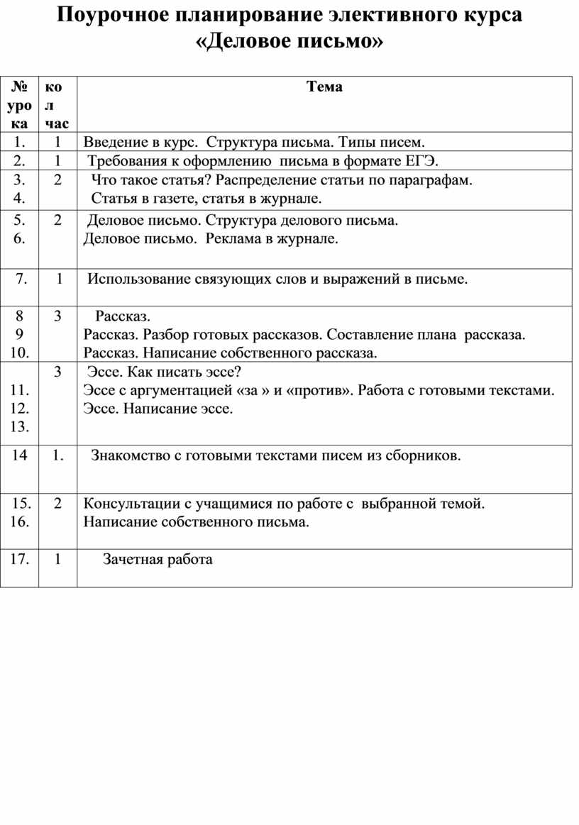 по элективному курсу «Деловое письмо»- 17 часов.