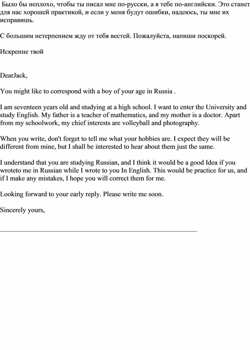 Я был рад получить твое приятное письмо и очень рад иметь друга по переписке из России.