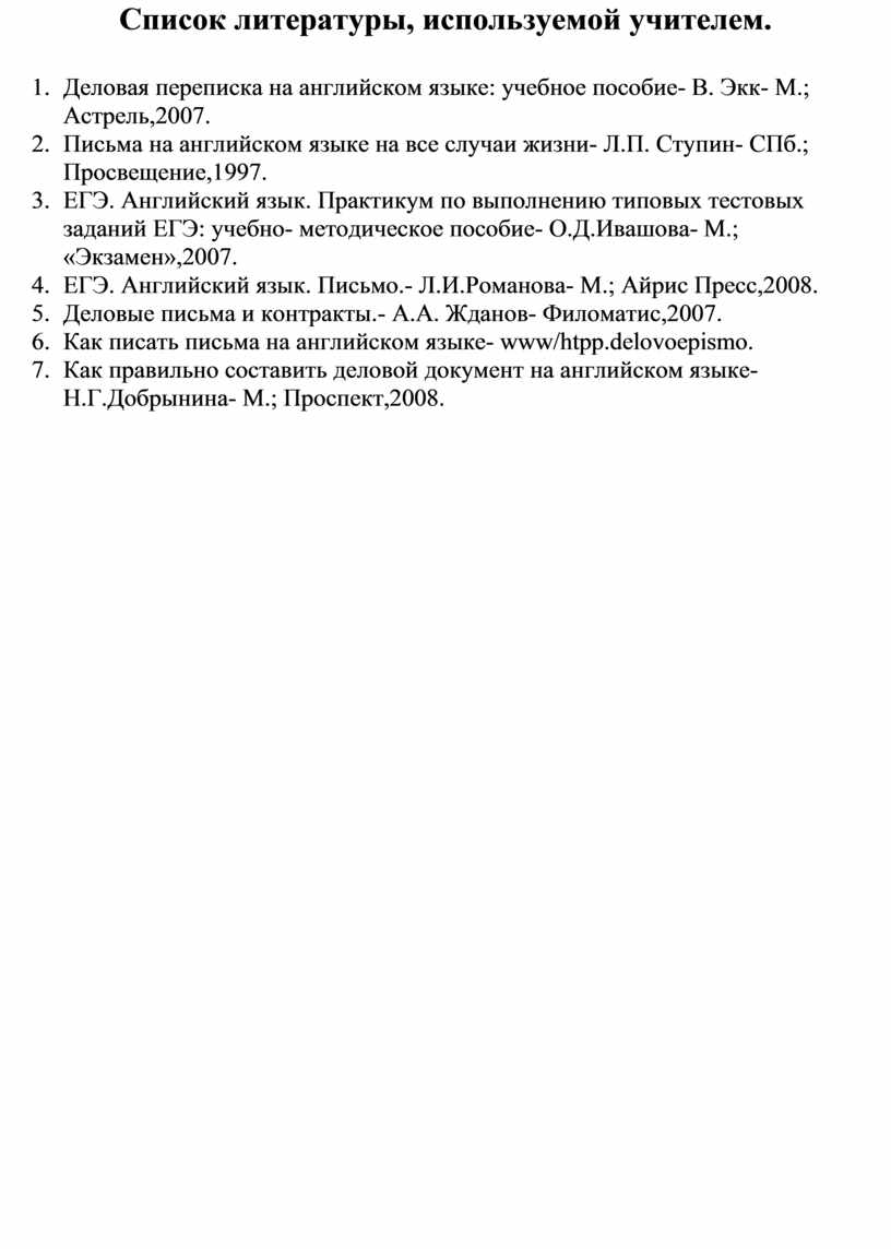 Данный элективный курс разработан для учащихся 11 классов ( общий объем курса составляет 17 часов) и ориентирован на государственный образовательный стандарт, так как одной из целей обучения иностранному языку включает формирование у учащихся способности пользоваться иноязычным письмом как способом обучения, познания и творчества. Программа «Деловое письмо » позволит учащимся совершенствовать свои навыки в написании официальных и неофициальных писем, рассказов, сочинений, статей и докладов. Курс предполагает тренировочные упражнения, направленных на отработку формата ЕГЭ, а также на включение материала личного характера, то есть создание условно-самостоятельных произведений.