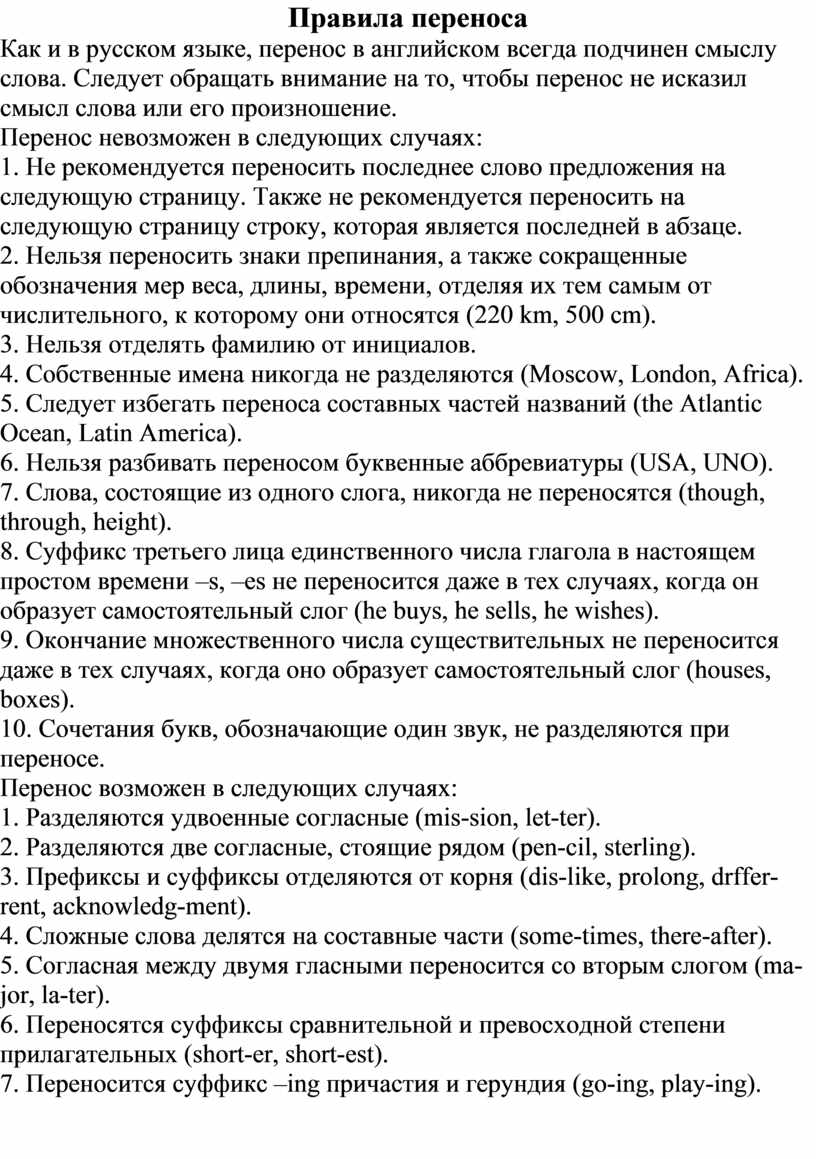 Как и в русском языке, перенос в английском всегда подчинен смыслу слова. Следует обращать внимание на то, чтобы перенос не исказил смысл слова или его произношение.