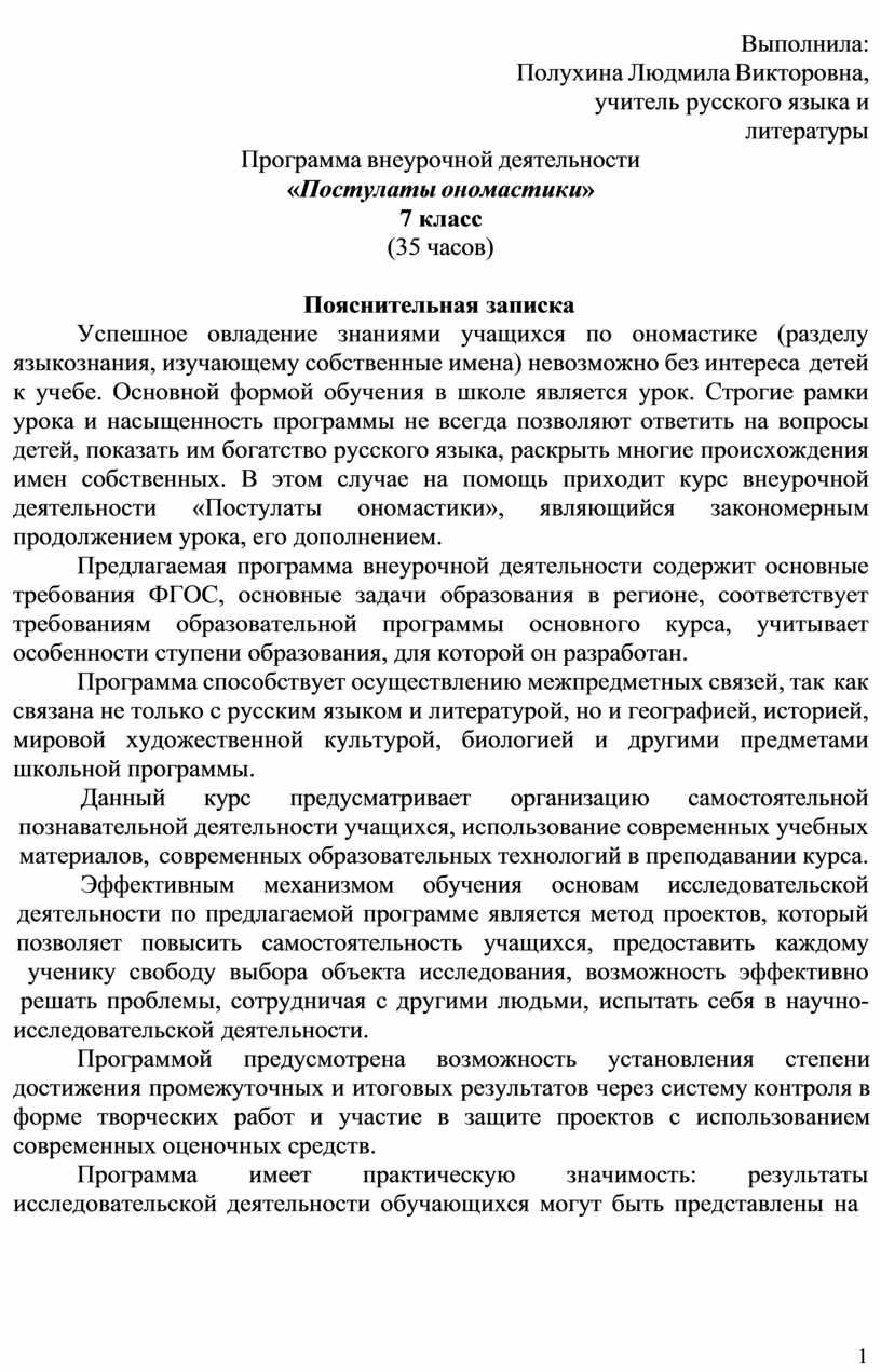 Успешное овладение знаниями учащихся по ономастике (разделу языкознания, изучающему собственные имена) невозможно без интереса детей к учебе. Основной формой обучения в школе является урок. Строгие рамки урока и насыщенность программы не всегда позволяют ответить на вопросы детей, показать им богатство русского языка, раскрыть многие происхождения имен собственных. В этом случае на помощь приходит курс внеурочной деятельности «Постулаты ономастики», являющийся закономерным продолжением урока, его дополнением.