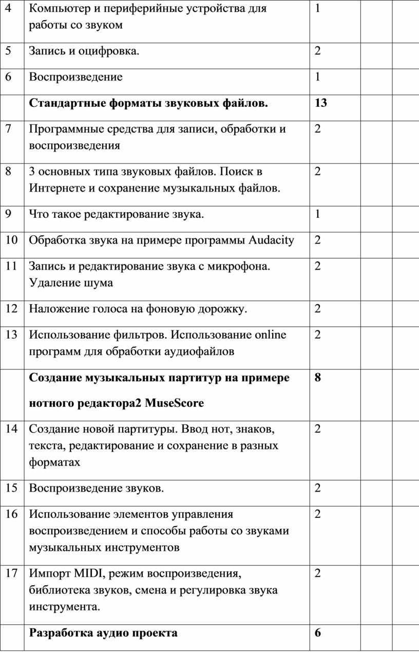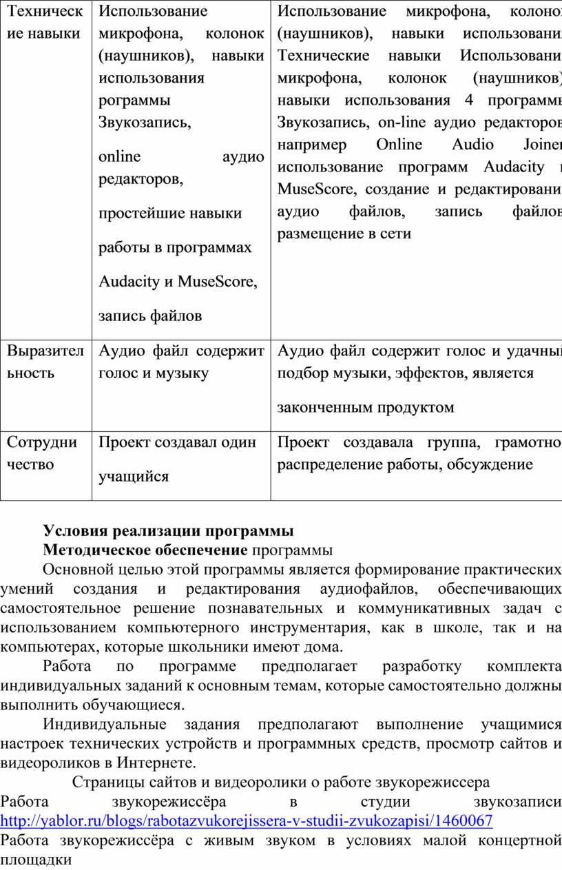 Программно-методическое обеспечение: стандартный набор офисных программ, свободно распространяемые программы Audacity, MuseScore, online редактор Online Audio Joiner.