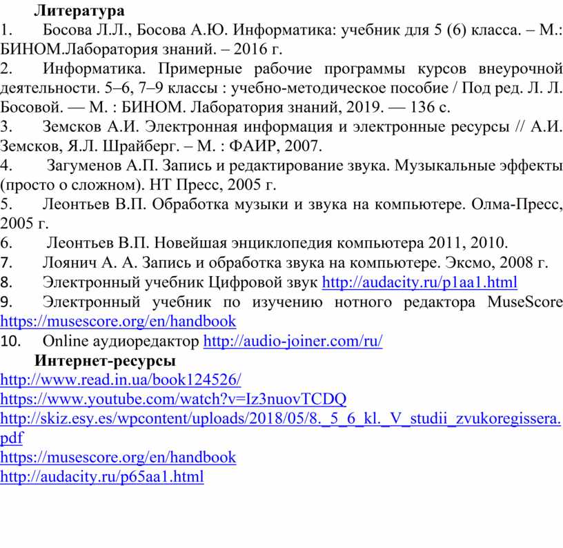 2. Информатика. Примерные рабочие программы курсов внеурочной деятельности. 5–6, 7–9 классы : учебно-методическое пособие / Под ред. Л. Л. Босовой. — М. : БИНОМ. Лаборатория знаний, 2019. — 136 с.