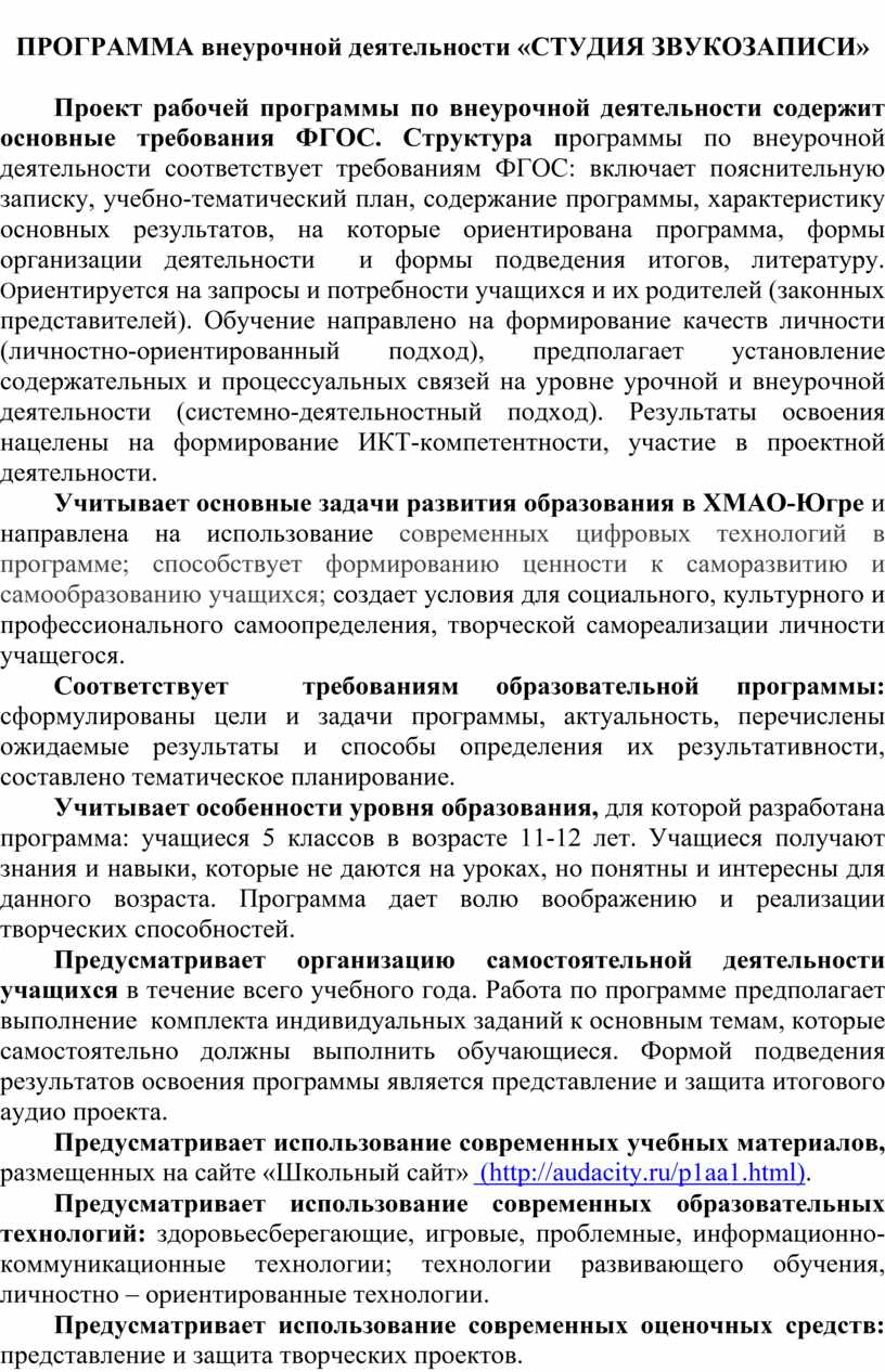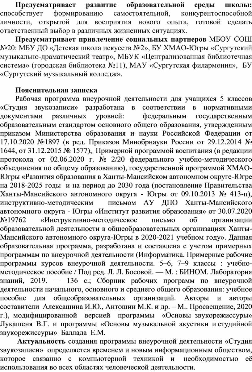 Рабочая программа внеурочной деятельности для учащихся 5 классов «Студия звукозаписи» разработана в соответствии в нормативными документами различных уровней: федеральным государственным образовательным стандартом основного общего образования, утвержденным приказом Министерства образования и науки Российской Федерации от 17.10.2020 №1897 (в ред. Приказов Минобрнауки России от 29.12.2014 № 1644, от 31.12.2015 № 1577), Примерной программой воспитания (в редакции протокола от 02.06.2020 г. № 2/20 федерального учебно-методического объединения по общему образованию), государственной программой ХМАО-Югры «Развития образования в Ханты-Мансийском автономном округе-Югре на 2018-2025 годы и на период до 2030 года (постановление Правительства Ханты-Мансийского автономного округа - Югры от 09.10.2013 № 413-п), инструктивно-методическим письмом АУ ДПО Ханты-Мансийского автономного округа - Югры «Институт развития образования» от 30.07.2020 №19762 «Инструктивно-методическое письмо об организации образовательной деятельности в общеобразовательных организациях Ханты-Мансийского автономного округа-Югры в 2020-2021 учебном году». Данная образовательная программа, разработана и составлена с учетом примерных программам по внеурочной деятельности (Информатика. Примерные рабочие программы курсов внеурочной деятельности. 5–6, 7–9 классы : учебно-методическое пособие / Под ред. Л. Л. Босовой. — М. : БИНОМ. Лаборатория знаний, 2019. — 136 с.; Сборник рабочих программ по внеурочной деятельности начального, основного и среднего общего образования: учебное пособие для общеобразовательных организаций. Авторы и авторы составители Алексашина И.Ю., Антошин М.К. и др. – М.. Просвещение, 2020 г.), модифицированной версией программы «Основы звукорежиссуры» Лукашеня В.Г. и программы «Основы музыкальной акустики и студийной звукорежиссуры» Баллада Е.М.