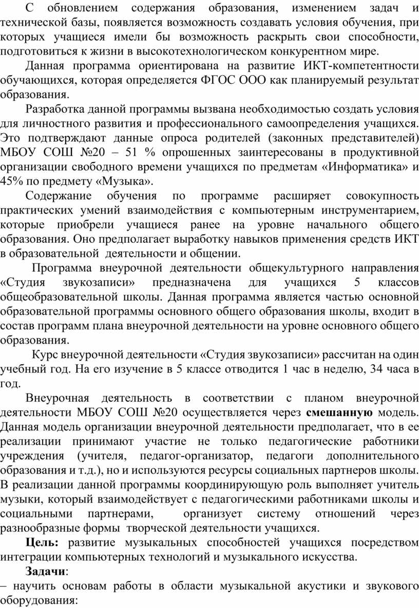 Актуальность создания программы внеурочной деятельности «Студия звукозаписи» определяется временем и новым информационным обществом, которое связанно с компьютерной техникой и необходимостью её использования во всех областях человеческой деятельности.