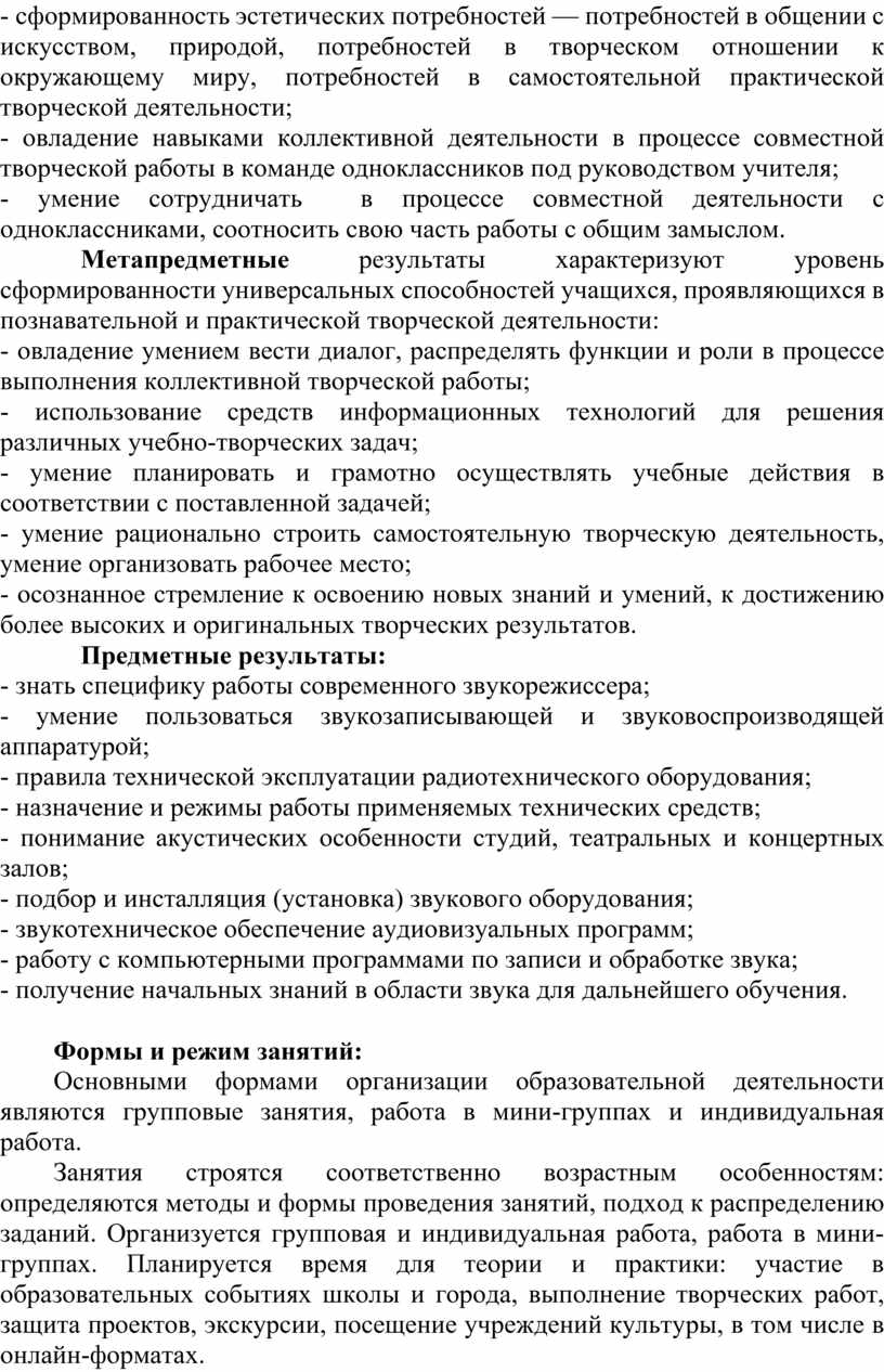 - получение начальных знаний в области звука для дальнейшего обучения.