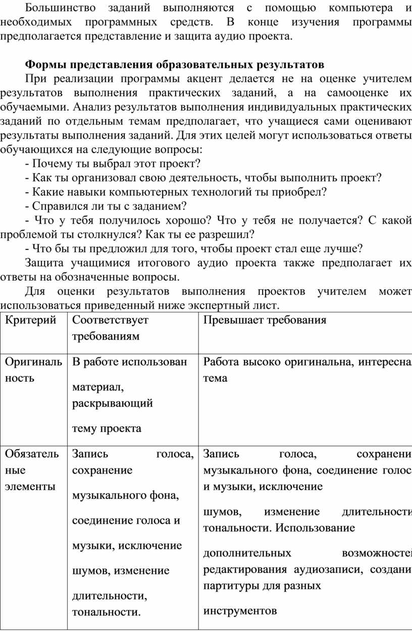 Предусматривает организацию самостоятельной деятельности учащихся в течение всего учебного года. Работа по программе предполагает выполнение комплекта индивидуальных заданий к основным темам, которые самостоятельно должны выполнить обучающиеся. Формой подведения результатов освоения программы является представление и защита итогового аудио проекта.