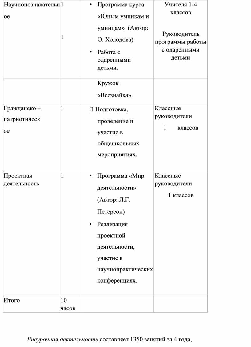 Внеурочная деятельность составляет 1350 занятий за 4 года,