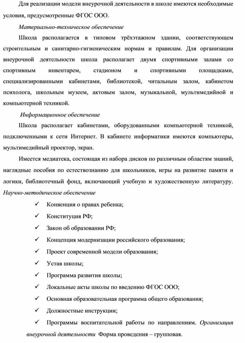 Для реализации модели внеурочной деятельности в школе имеются необходимые условия, предусмотренные ФГОС ООО.