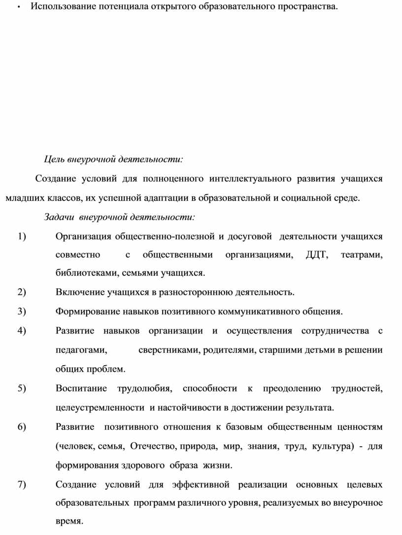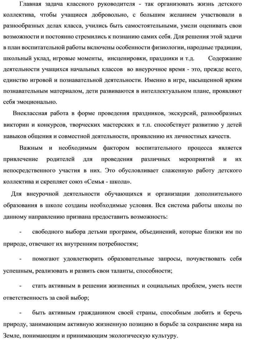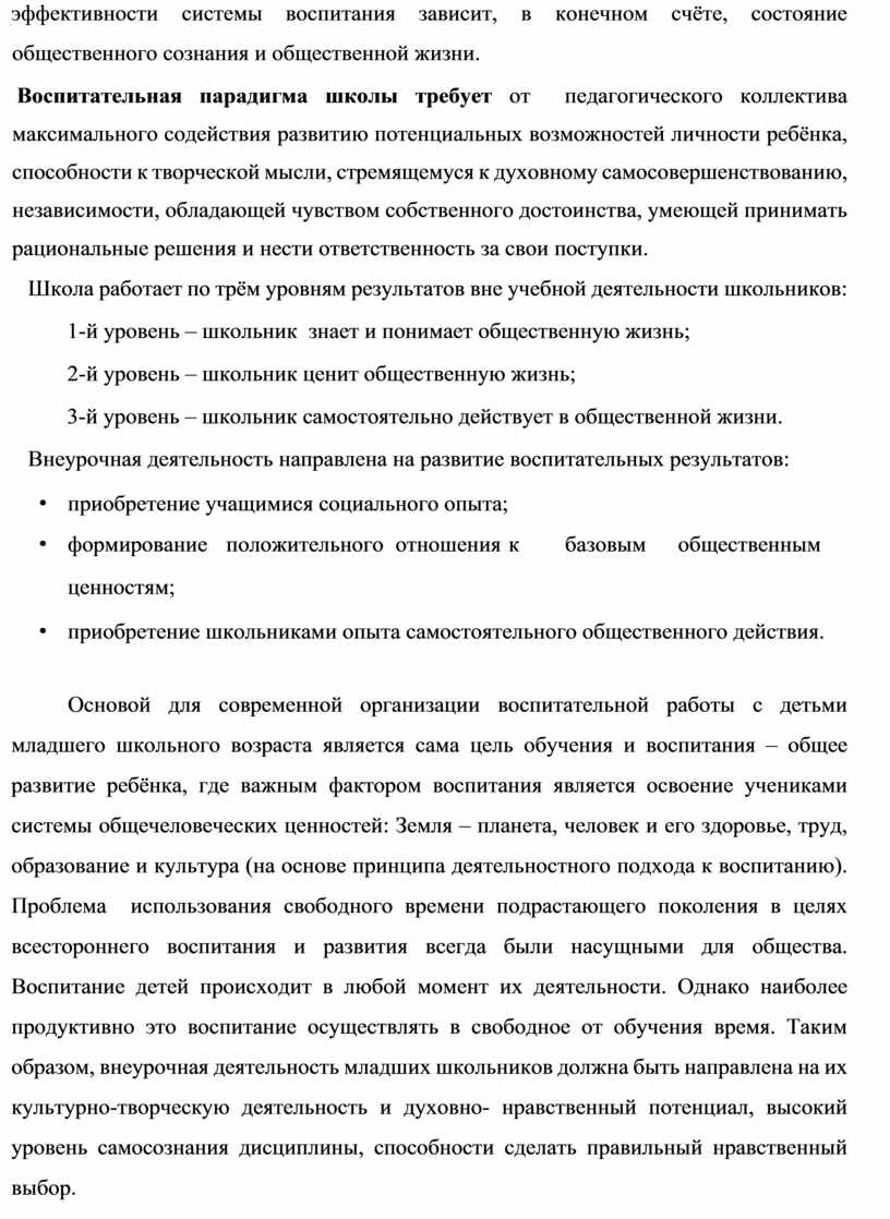 Основой для современной организации воспитательной работы с детьми младшего школьного возраста является сама цель обучения и воспитания – общее развитие ребёнка, где важным фактором воспитания является освоение учениками системы общечеловеческих ценностей: Земля – планета, человек и его здоровье, труд, образование и культура (на основе принципа деятельностного подхода к воспитанию). Проблема использования свободного времени подрастающего поколения в целях всестороннего воспитания и развития всегда были насущными для общества. Воспитание детей происходит в любой момент их деятельности. Однако наиболее продуктивно это воспитание осуществлять в свободное от обучения время. Таким образом, внеурочная деятельность младших школьников должна быть направлена на их культурно-творческую деятельность и духовно- нравственный потенциал, высокий уровень самосознания дисциплины, способности сделать правильный нравственный выбор.