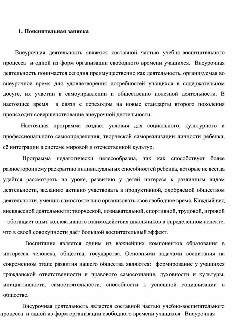 Внеурочная деятельность является составной частью учебно-воспитательного процесса и одной из форм организации свободного времени учащихся. Внеурочная деятельность понимается сегодня преимущественно как деятельность, организуемая во внеурочное время для удовлетворения потребностей учащихся в содержательном досуге, их участии в самоуправлении и общественно полезной деятельности.