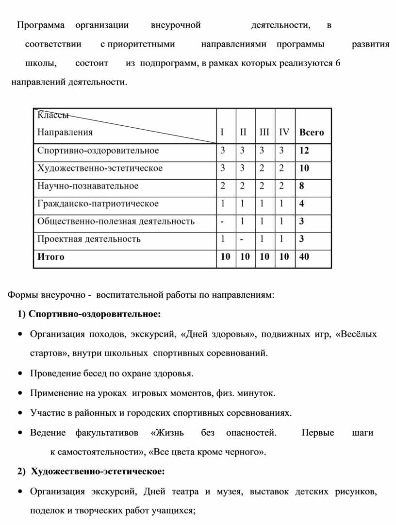 Часы, отводимые на внеурочную деятельность, используются по желанию учащихся и направлены на реализацию различных форм ее организации, отличных от урочной системы обучения. Занятия проводятся в форме экскурсий, кружков, секций, круглых столов, конференций, диспутов, викторин, праздничных мероприятий, классных часов, школьных научных обществ, олимпиад, соревнований, поисковых и научных исследований. Посещая кружки и секции, учащиеся прекрасно адаптируются в среде сверстников, благодаря индивидуальной работе руководителя, глубже изучается материал. На занятиях руководители стараются раскрыть у учащихся такие способности, как организаторские, творческие, музыкальные, что играет немаловажную роль в духовном развитии подростков.