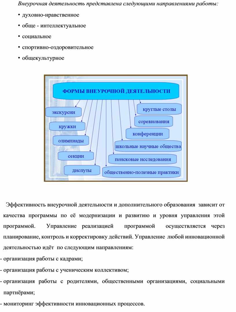 Эффективность внеурочной деятельности и дополнительного образования зависит от качества программы по её модернизации и развитию и уровня управления этой программой. Управление реализацией программой осуществляется через планирование, контроль и корректировку действий. Управление любой инновационной деятельностью идёт по следующим направлениям: