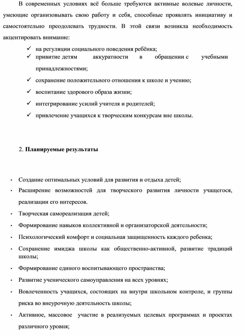Увеличение числа детей, охваченных организованным досугом; воспитание уважительного отношения к родному дому, к школе, городу; воспитание у детей толерантности, навыков здорового образа жизни; формирование чувства гражданственности и патриотизма, правовой культуры, осознанного отношения к профессиональному самоопределению; развитие социальной культуры учащихся через систему ученического самоуправления и реализация, в конечном счете, основной цели программы – достижение учащимися необходимого для жизни в обществе социального опыта и формирование в них принимаемой обществом системы ценностей.