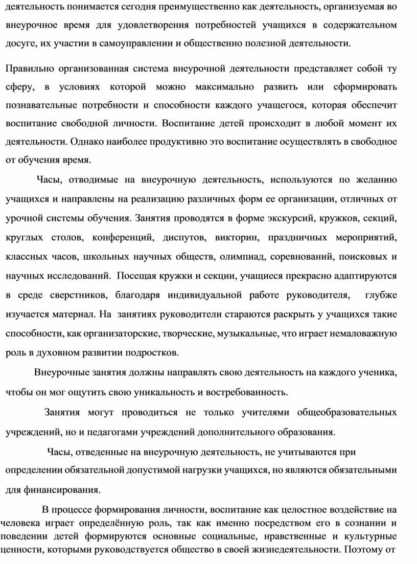 Правильно организованная система внеурочной деятельности представляет собой ту сферу, в условиях которой можно максимально развить или сформировать познавательные потребности и способности каждого учащегося, которая обеспечит воспитание свободной личности. Воспитание детей происходит в любой момент их деятельности. Однако наиболее продуктивно это воспитание осуществлять в свободное от обучения время.
