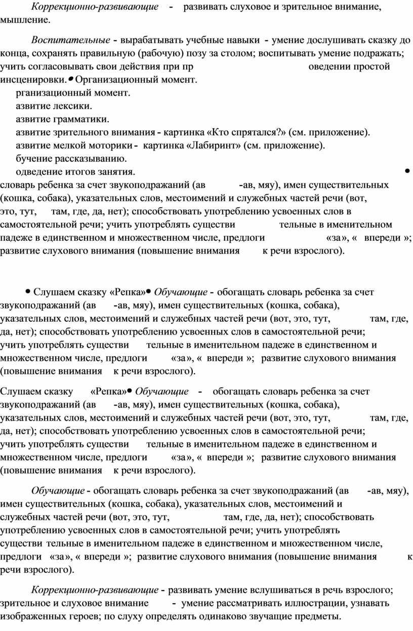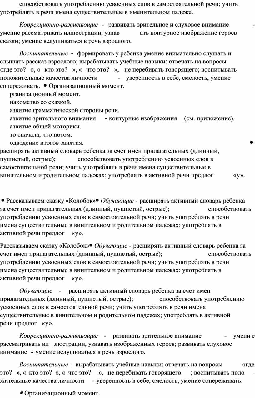Обучающие - совершенствовать мелкую моторику; учить правильно держать карандаш или фломастер; учить использовать в активной речи предлоги «в», «под»; называть детенышей животных; учить помогать проводить простую инсценировку знакомой сказки. Коррекционно-развивающие - развивать слуховое и зрительное внимание ребенка, логическое мышление - умение сравнивать, анализировать. Воспитательные - вырабатывать учебные навыки - умение дослушивать сказку до конца, держать правильную (рабочую) позу за столом; воспитывать умение подражать; учить согласовывать свои действия при проведении простой инсценировки.