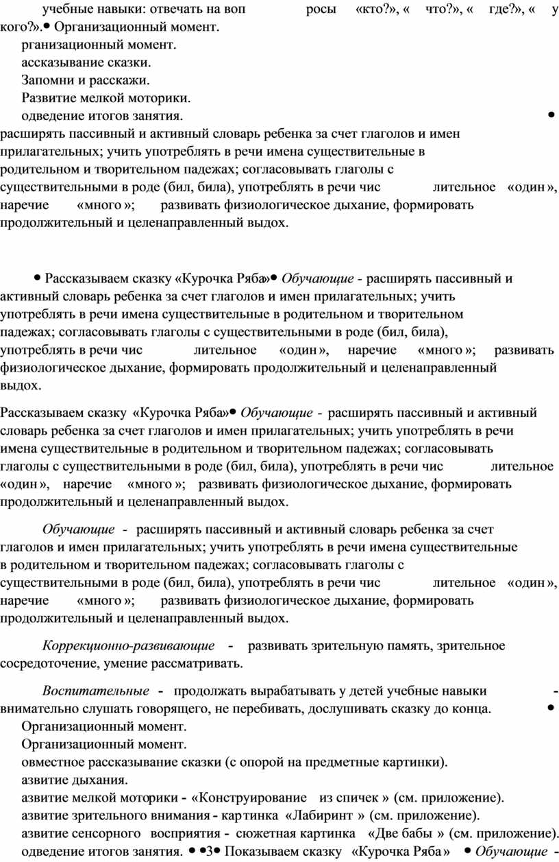 1. Организационный момент. 2. Знакомство со сказкой. 3. Развитие грамматической стороны речи. 4. Развитие зрительного внимания - контурные изображения героев сказки (см. приложение). 5. Развитие общей моторики. 6. Кто сначала, кто потом. 7. Подведение итогов занятия.
