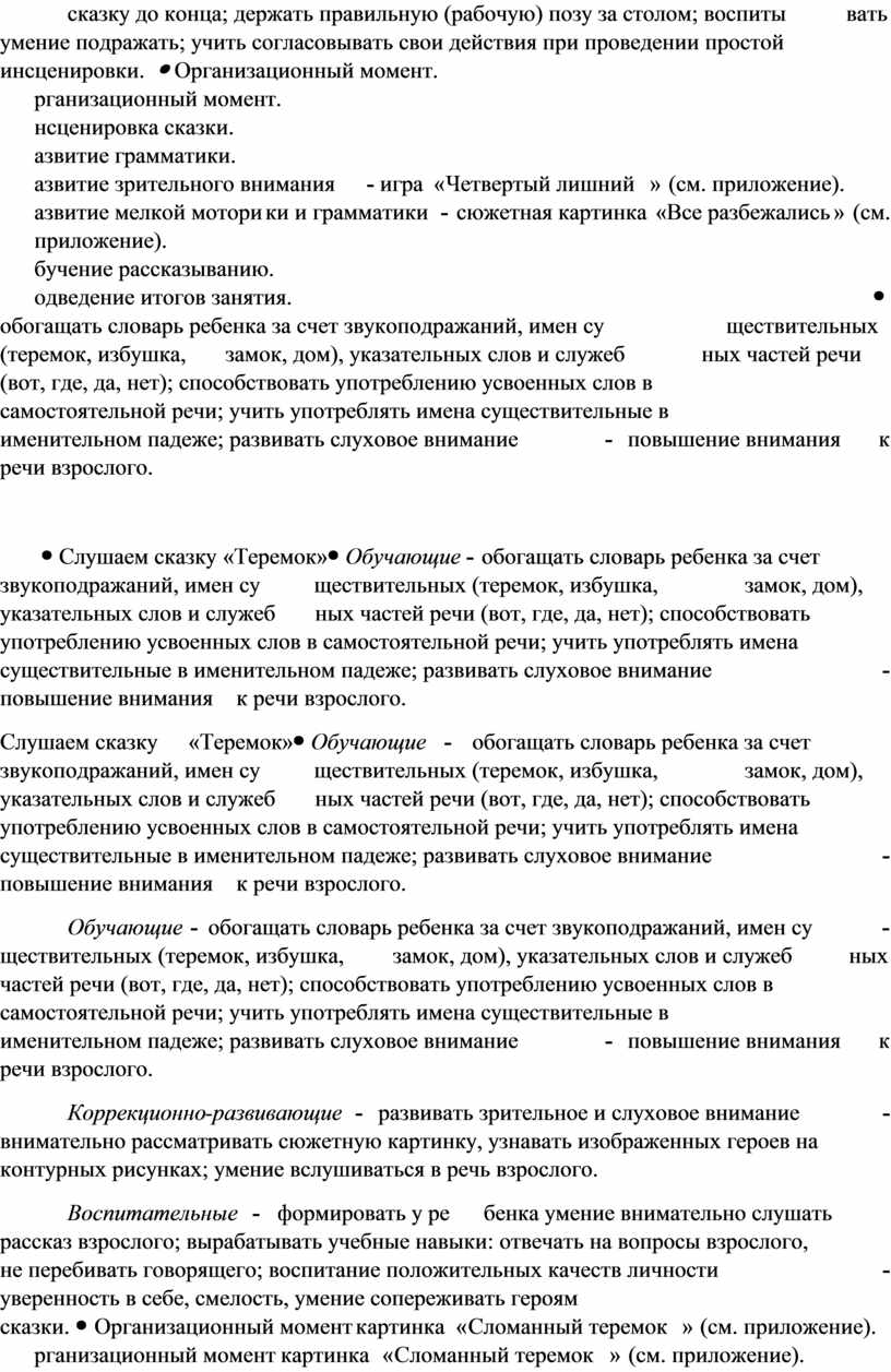 1. Организационный момент картинка «Сломанный теремок» (см. приложение). 2. Знакомство со сказкой. 3. Развитие грамматической стороны речи. 4. Развитие зрительного внимания - предметные картинки «Дома», контурные изображения животных - героев сказки (см. приложение). 5. Развитие общей моторики. 6. Кто сначала, кто потом. 7. Подведение итогов занятия. |