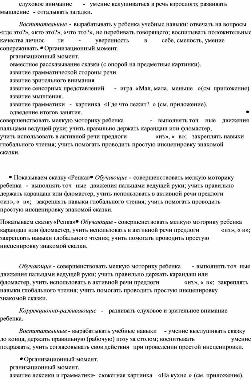 Обучающие - совершенствовать мелкую моторику ребенка - выполнять точные движения пальцами ведущей руки; учить правильно держать карандаш или фломастер, учить использовать в активной речи предлоги «из», «в»; закреплять навыки глобального чтения; учить помогать проводить простую инсценировку знакомой сказки. Коррекционно-развивающие - развивать слуховое и зрительное внимание ребенка. Воспитательные - вырабатывать учебные навыки - умение выслушивать сказку до конца, держать правильную (рабочую) позу за столом; воспитывать умение подражать; учить согласовывать свои действия при проведении простой инсценировки.
