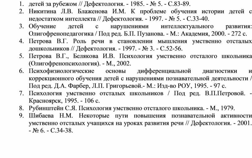 9. Петрова В.Г. Роль речи в становлении мышления умственно отсталых дошкольников // Дефектология. - 1997. - № 3. - С.52-56.