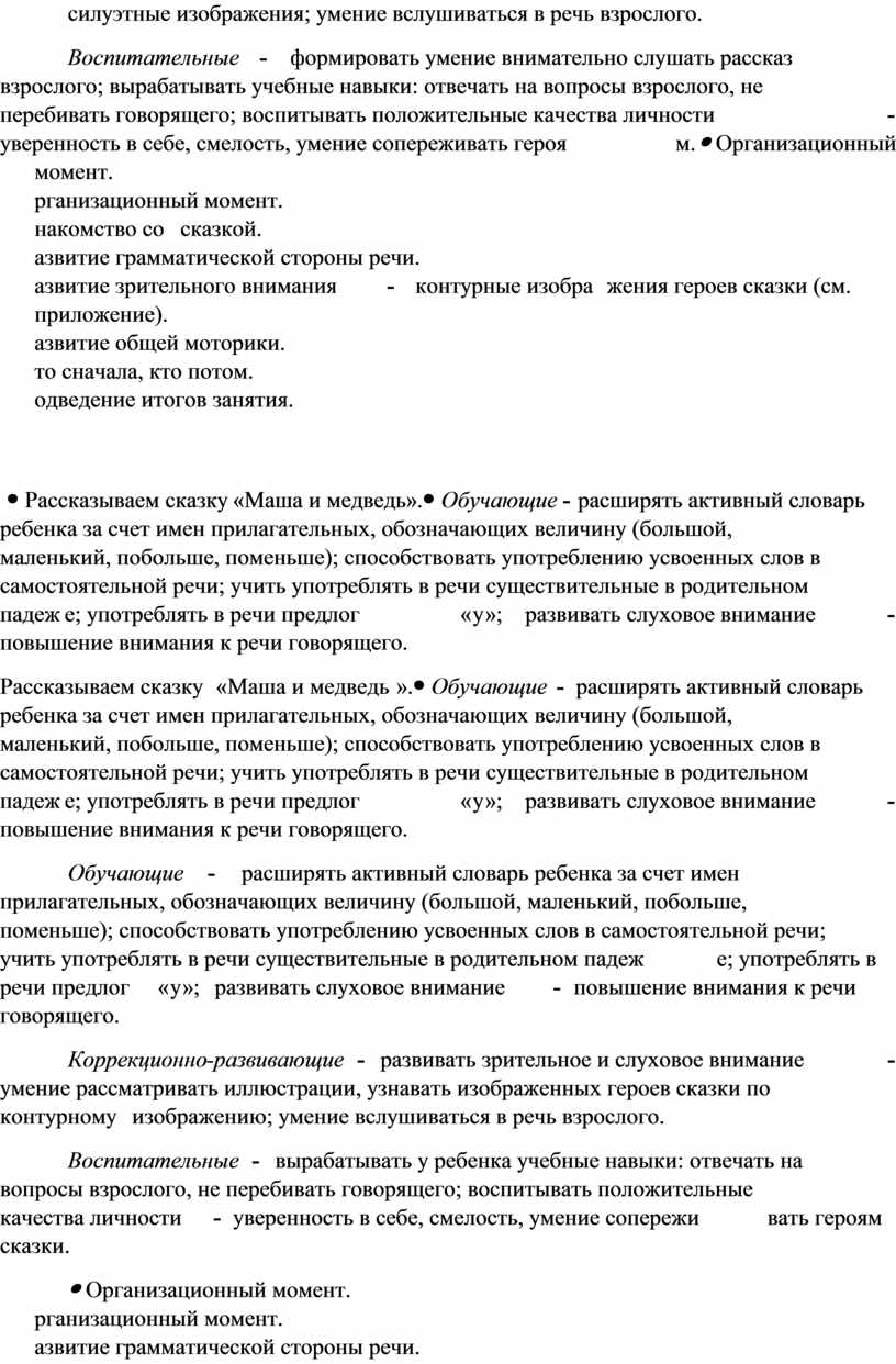 Обучающие - расширять активный словарь ребенка за счет имен прилагательных, обозначающих величину (большой, маленький, больше, меньше); способствовать употреблению усвоенных слов в самостоятельной речи; учить употреблять в речи имена существительные в именительном падеже в единственном и множественном числе; развитие слухового внимания - повышение внимания к речи взрослого. Коррекционно-развивающие - развивать зрительное и слуховое внимание - умение рассматривать иллюстрации, узнавать контурные изображения животных; умение вслушиваться в речь взрослого. Воспитательные - вырабатывать учебные навыки у ребенка: отвечать на вопросы взрослого, не перебивать говорящего; воспитывать положительные качества личности - уверенность в себе, смелость, умение сопереживать героям. |