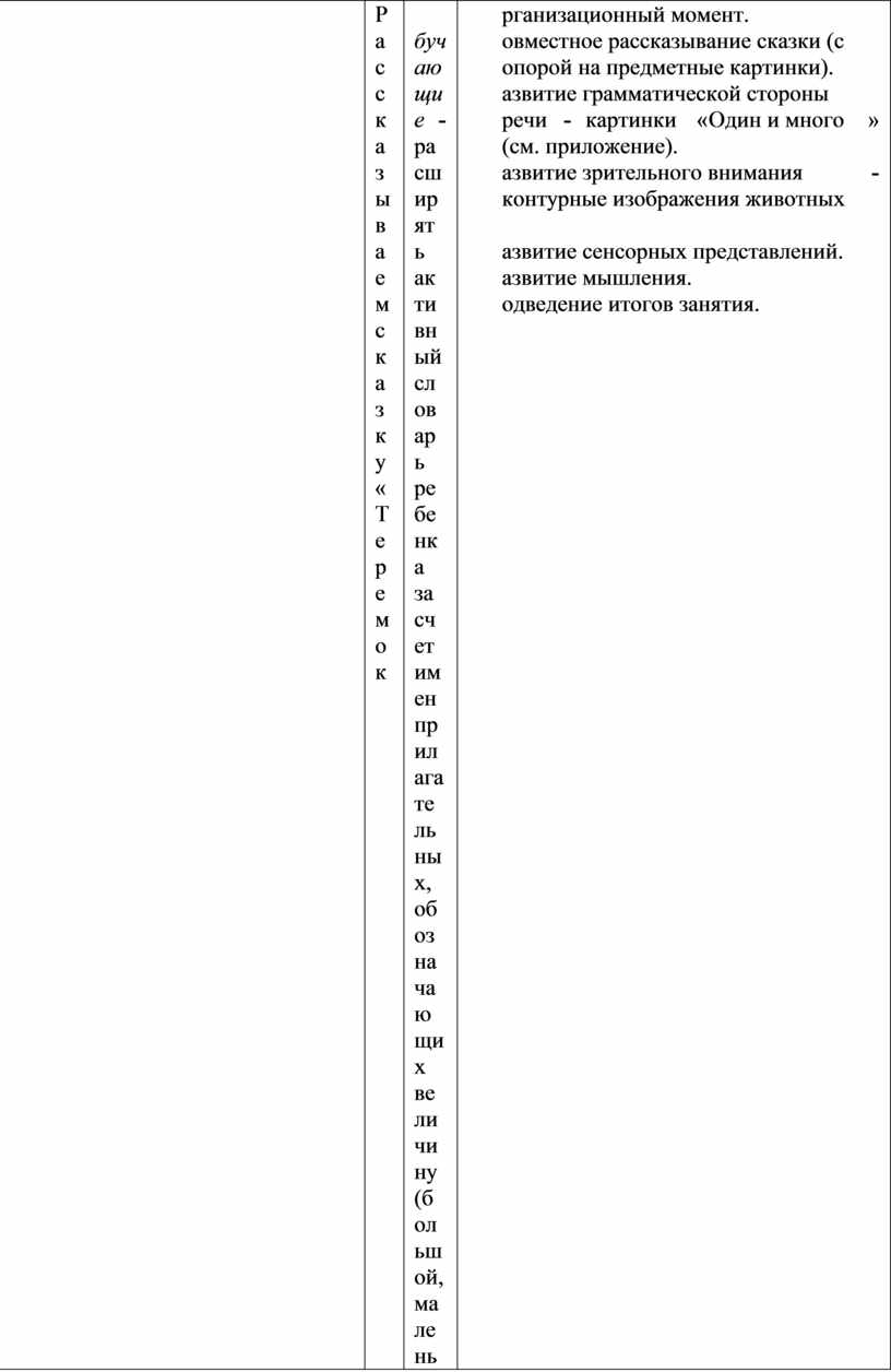 1. Организационный момент. 2. Совместное рассказывание сказки (с опорой на предметные картинки). 3. Развитие грамматической стороны речи. 4. Развитие зрительного внимания. 5. Развитие сенсорных представлений - игра «Мал, мала, меньше»(см. приложение). 6. Развитие мышления. 7. Развитие грамматики- картинка «Где что лежит?» (см. приложение). 8. Подведение итогов занятия. |