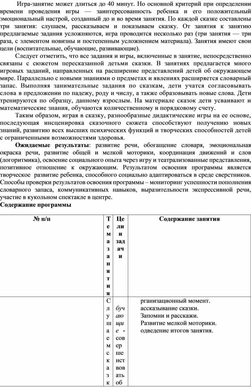 Программа «В гостях у сказки» не может быть рассчитана на определённый отрезок времени. Это обусловлено различной степенью тяжести и выраженности недоразвития познавательных процессов каждого конкретного ребёнка. Каждый конкретный ребёнок будет осваивать данную программу в соответствии со своими возможностями и способностям и в своём темпе продвигаться в развитии.