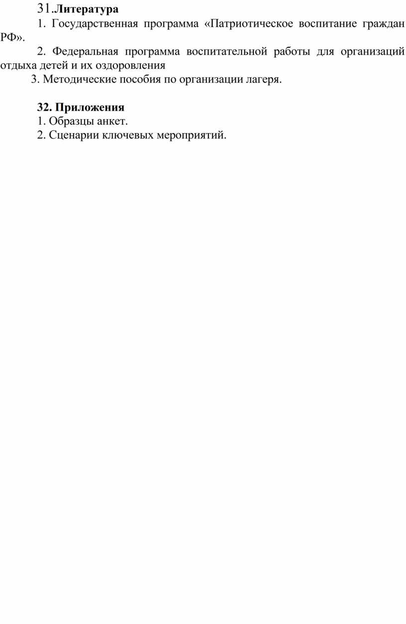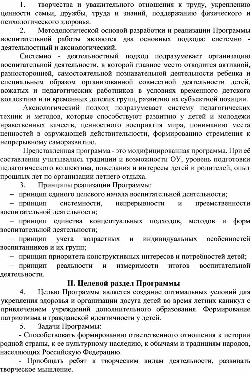 13. Целью Программы является создание оптимальных условий для укрепления здоровья и организации досуга детей во время летних каникул с привлечением учреждений дополнительного образования. Формирование патриотизма и гражданской идентичности у детей.