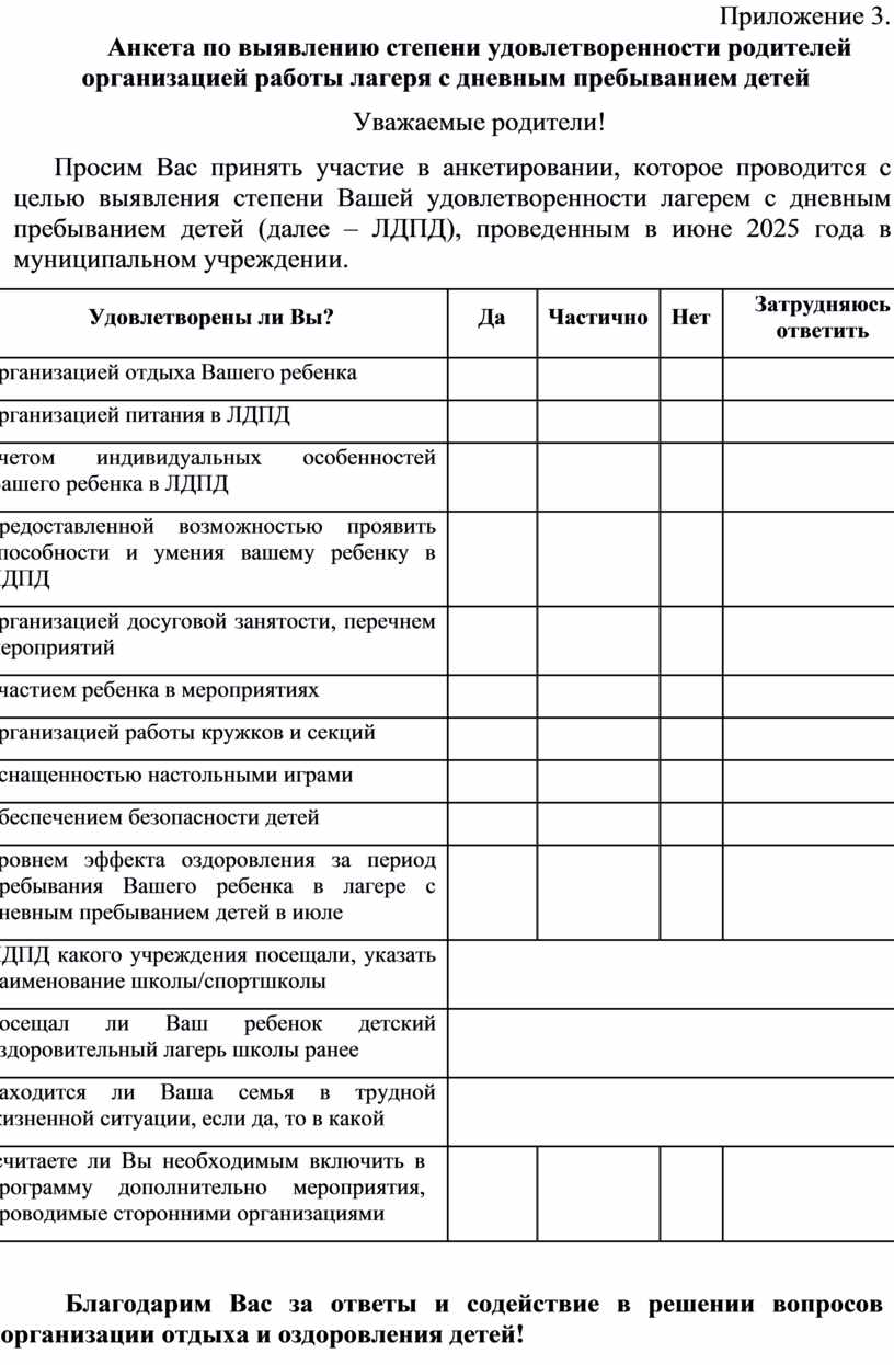 Просим Вас принять участие в анкетировании, которое проводится с целью выявления степени Вашей удовлетворенности лагерем с дневным пребыванием детей (далее – ЛДПД), проведенным в июне 2025 года в муниципальном учреждении.