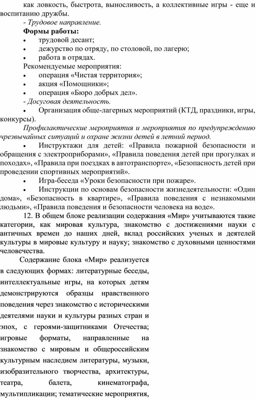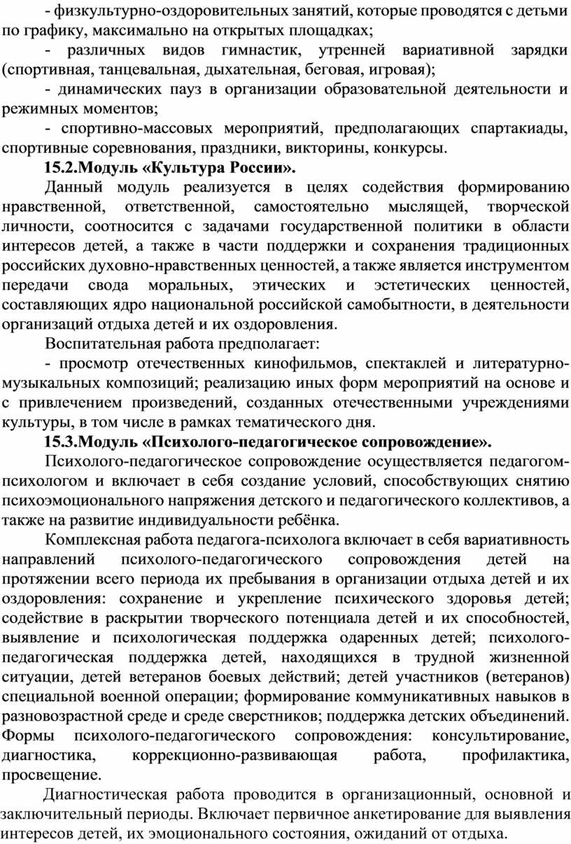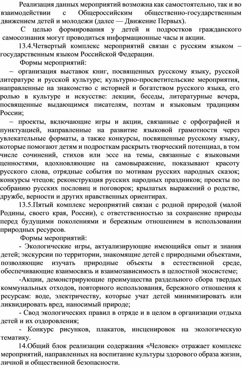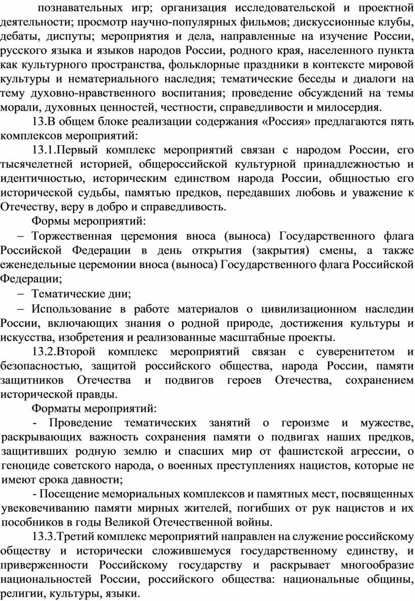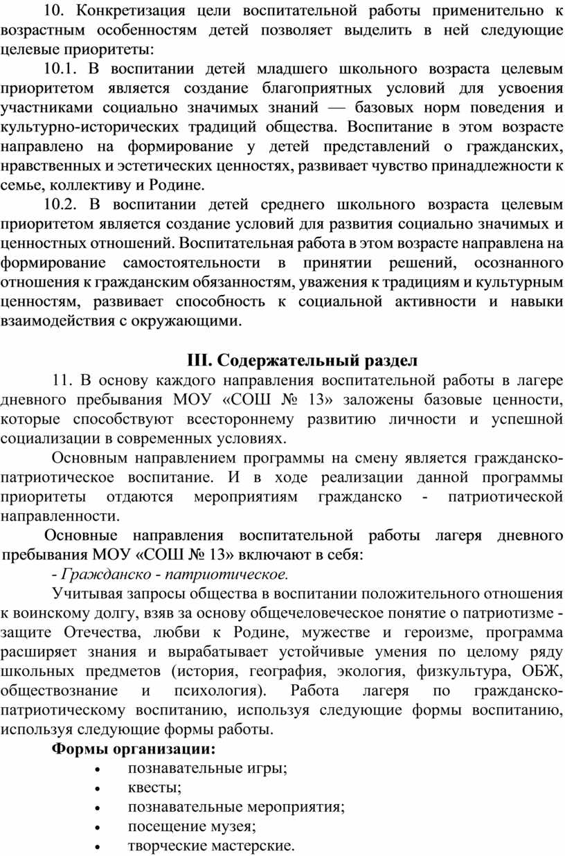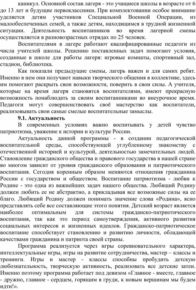 10. Программа разработана с учетом возрастных и психологических особенностей участников, направлена на формирование у них патриотизма, социальной ответственности и уважения к многообразию культур народов России, а также развитие личностных качеств, способствующих успешной социализации, формированию экологического сознания и эстетического вкуса, развитию способностей к самовыражению в различных видах творчества и уважительного отношения к труду, укреплению ценности семьи, дружбы, труда и знаний, поддержанию физического и психологического здоровья.