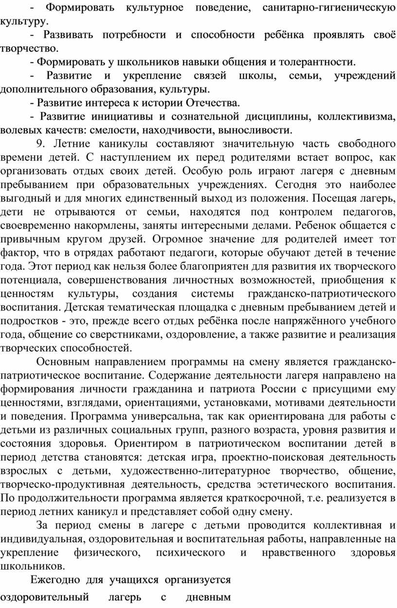 9. Летние каникулы составляют значительную часть свободного времени детей. С наступлением их перед родителями встает вопрос, как организовать отдых своих детей. Особую роль играют лагеря с дневным пребыванием при образовательных учреждениях. Сегодня это наиболее выгодный и для многих единственный выход из положения. Посещая лагерь, дети не отрываются от семьи, находятся под контролем педагогов, своевременно накормлены, заняты интересными делами. Ребенок общается с привычным кругом друзей. Огромное значение для родителей имеет тот фактор, что в отрядах работают педагоги, которые обучают детей в течение года. Этот период как нельзя более благоприятен для развития их творческого потенциала, совершенствования личностных возможностей, приобщения к ценностям культуры, создания системы гражданско-патриотического воспитания. Детская тематическая площадка с дневным пребыванием детей и подростков - это, прежде всего отдых ребёнка после напряжённого учебного года, общение со сверстниками, оздоровление, а также развитие и реализация творческих способностей.